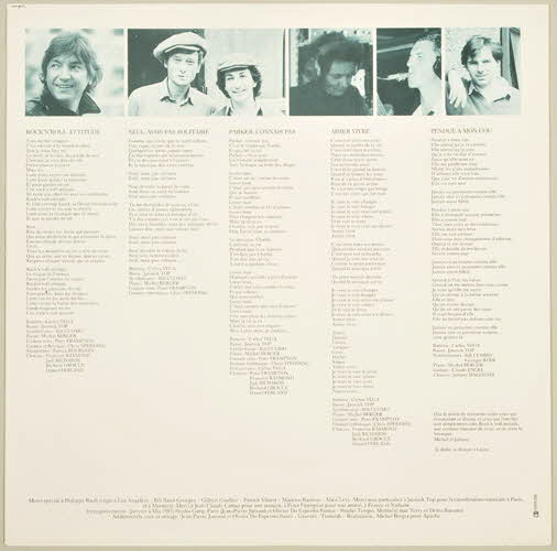Que le point de rencontre entre ceux qui écouteront ce disque et ceux qui l'ont fait soit simplement cette Rock'n'roll attitude, une certaine manière de vivre, et de vivre la musique. // Michel et Johnny // Je dédie ce disque à Laura (sur le livret (enveloppe de protection))NE PEUT ETRE / VENDU // ECHANTILLON / GRATUIT (sur un autocollant au dos de la pochette)Philips // 824 824-1 (référence de l'album)Décor