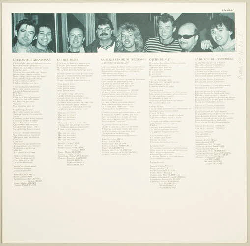 guitare rythmique / synthétiseur / saxophone / choeur / gravure / batterie / réalisation pour Apache // paroles et musique // piano // choeur / choeur / choeur / enregistrement (janvier à mai 1985) au Studio Gang, Paris // mixage / enregistrements (janvier à mai 1985) Studio Tempo, Montréal / synthétiseur / enregistrement (janvier à mai 1985) au Studio Gang, Paris // mixage / basse // coordination musicale à Paris et à Montréal / enregistrements (janvier à mai 1985) Studio Tempo, Montréal / choeur / guitare / choeur / guitare solo / kurzweil / percussions / maison de disques / publication Phonogram