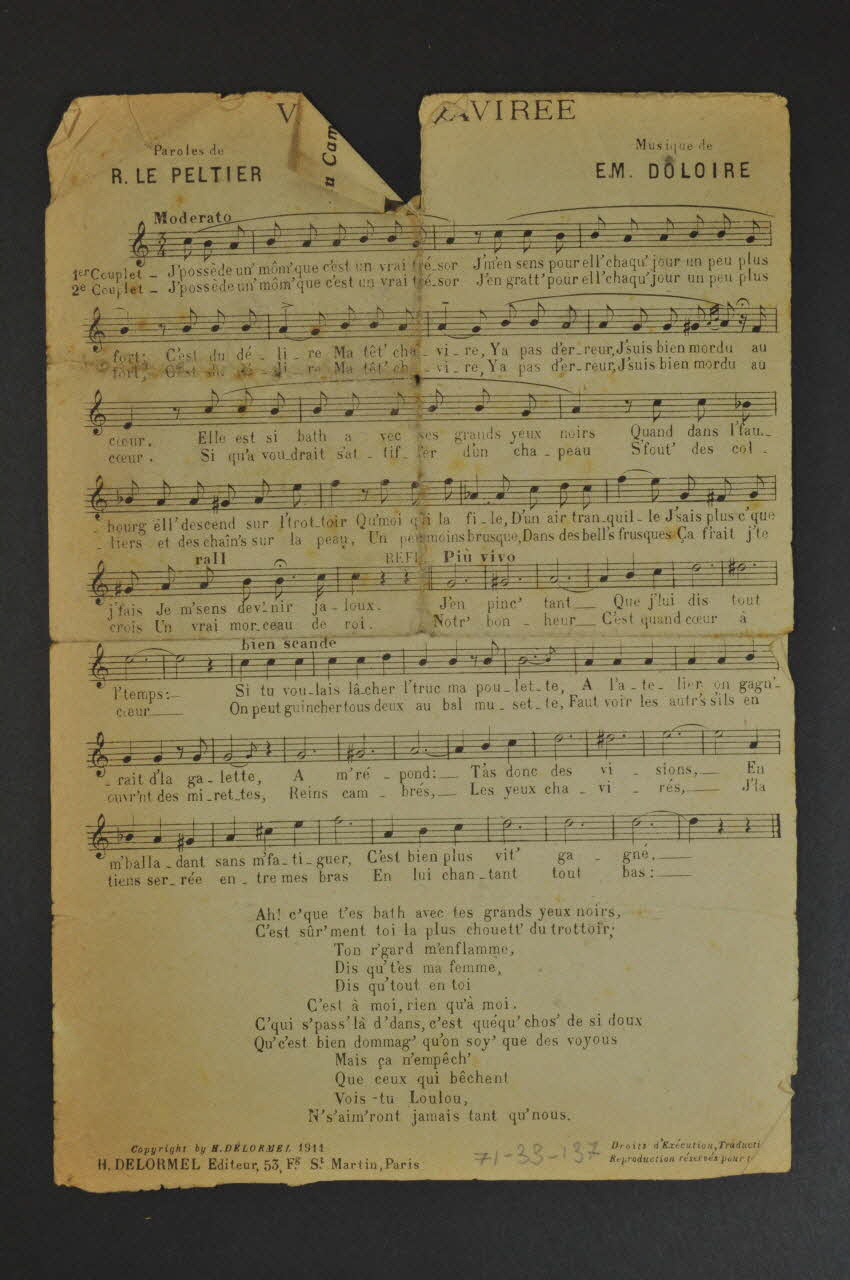 Les inscriptions renseignent le titre de la chanson, le nom des auteurs, de l'artiste et de l'éditeur. Au dos partitions et paroles de la chanson. L'intérieur est laissé vierge.Dimensions et poids