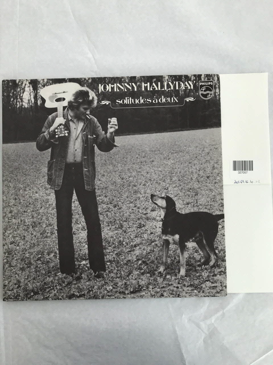 disque en viinyle de couleur noire / pochette en carton / enveloppe de protection en papier / pochette double - au verso, photographie en noir et blanc de Johnny Hallyday dans un champs portant sa guitare sur une épaule, fumant une cigarette, avec à ses côtés un chien - à l'intérieur de la pochette, photographie en couleur de Johnny en tenue de scène (style indien) - au verso de la pochette, photographie en noir et blanc de Johnny, assis, de dos, jouant de la guitare dans un paysage campagnard avec un chien à ses côtés / inscriptions sur la partie centrale du disque de couleur grise sur fond noirInscriptions