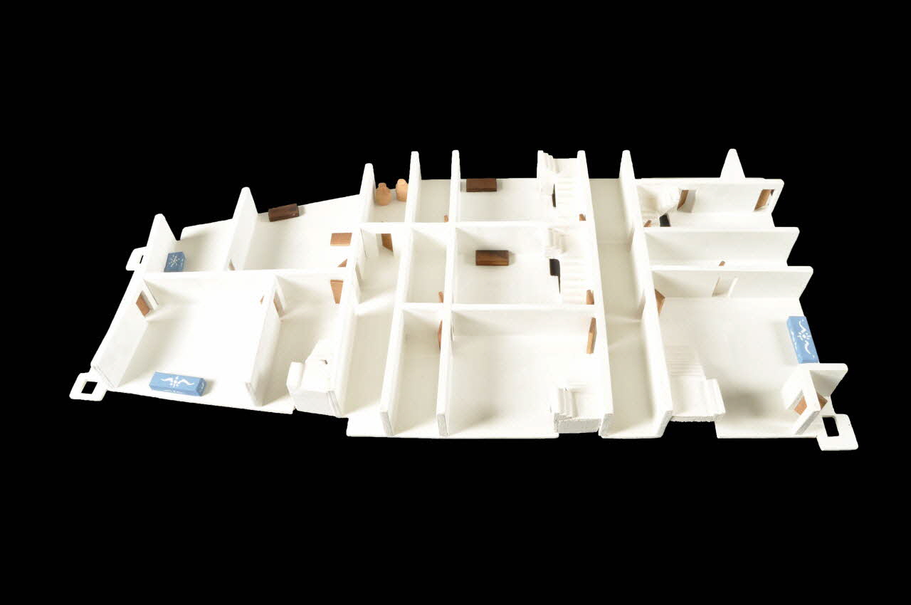 Sur un plateau carré s'éléve un édifice de plan rectangulaire affiné à une extrémité. Il est en contreplaqué peint en ocre et orné en partie supérieure de motifs géometriques au crayon gras noir. A l'intérieur, se trouvent quatre niveaux dont trois sont amovibles (2003.8.115.2.2-4) avec la représentation de différents usages dans chaque pièce et chaque niveau. Sur un côté, le mur (2003.8.115.2.5) du "tighermt" se soulève laissant entrevoir la coupe des différents niveaux.Décor