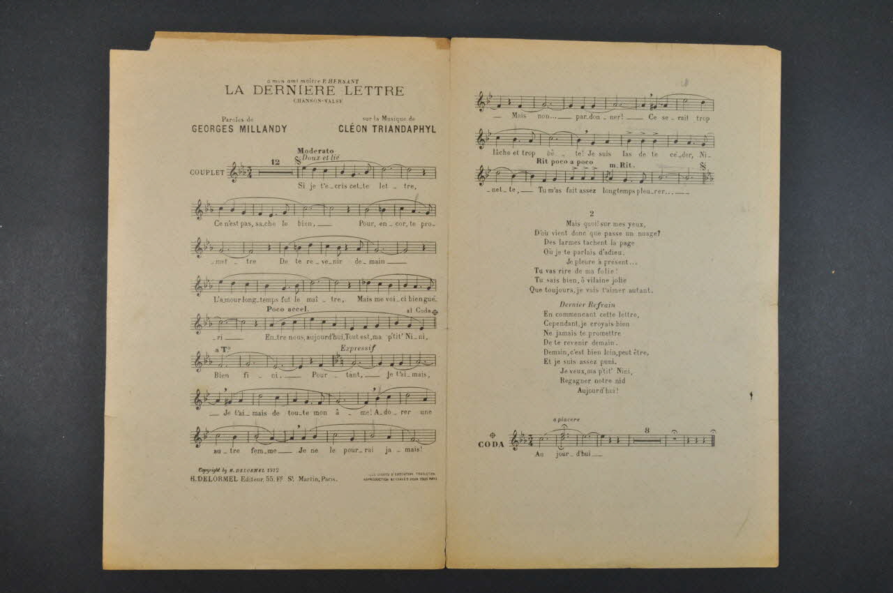Des inscriptions renseignent le titre, les auteurs, les exécutants et l'éditeur. A l'intérieur, partition et paroles de la chanson. Au dos, liste d'autres partitions publiées par l'éditeur.Inscriptions