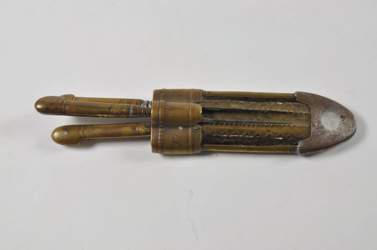 Cuivre jaune battu, gravé, estampé. Fer forgé. Bois taillé et évidé. / .1 : Etui rectangulaire en bois, à trois évidements et décoré de motifs géométriques gravés. Recouvert de cuivre jaune orné de quatre chevaux attelés, tirant une carriole avec un cocher. Extrémité inférieure arrondie en fer. Inscription à l'extrémité supérieure.