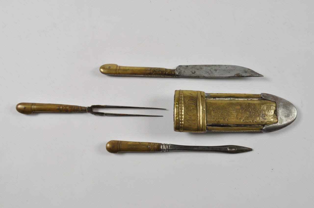 .2 : Fourchette avec un manche en cuivre jaune gravé et à deux dents en fer. .3 : Couteau avec un manche en cuivre jaune gravé et une lame en fer marquée de trois croix d'un côté, d'un soleil de l'autre. .4 : Instrument avec un manche en cuivre jaune gravé et une lame triangulaire munie d'un trou en fer.Décor