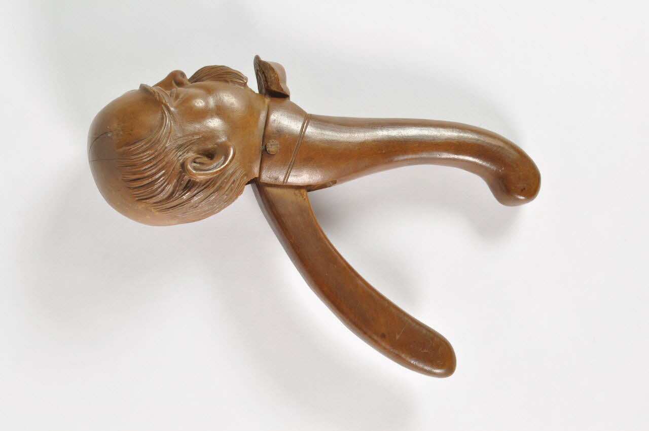 Bois taillé et sculpté / Casse-noisettes en bois taillé et sculpté à deux branches en arc de cercle dont une est reliée à la sculpture du visage d'un homme chauve et moustachu représentant Bismarck avec la bouche articulée et chevillée.Décor