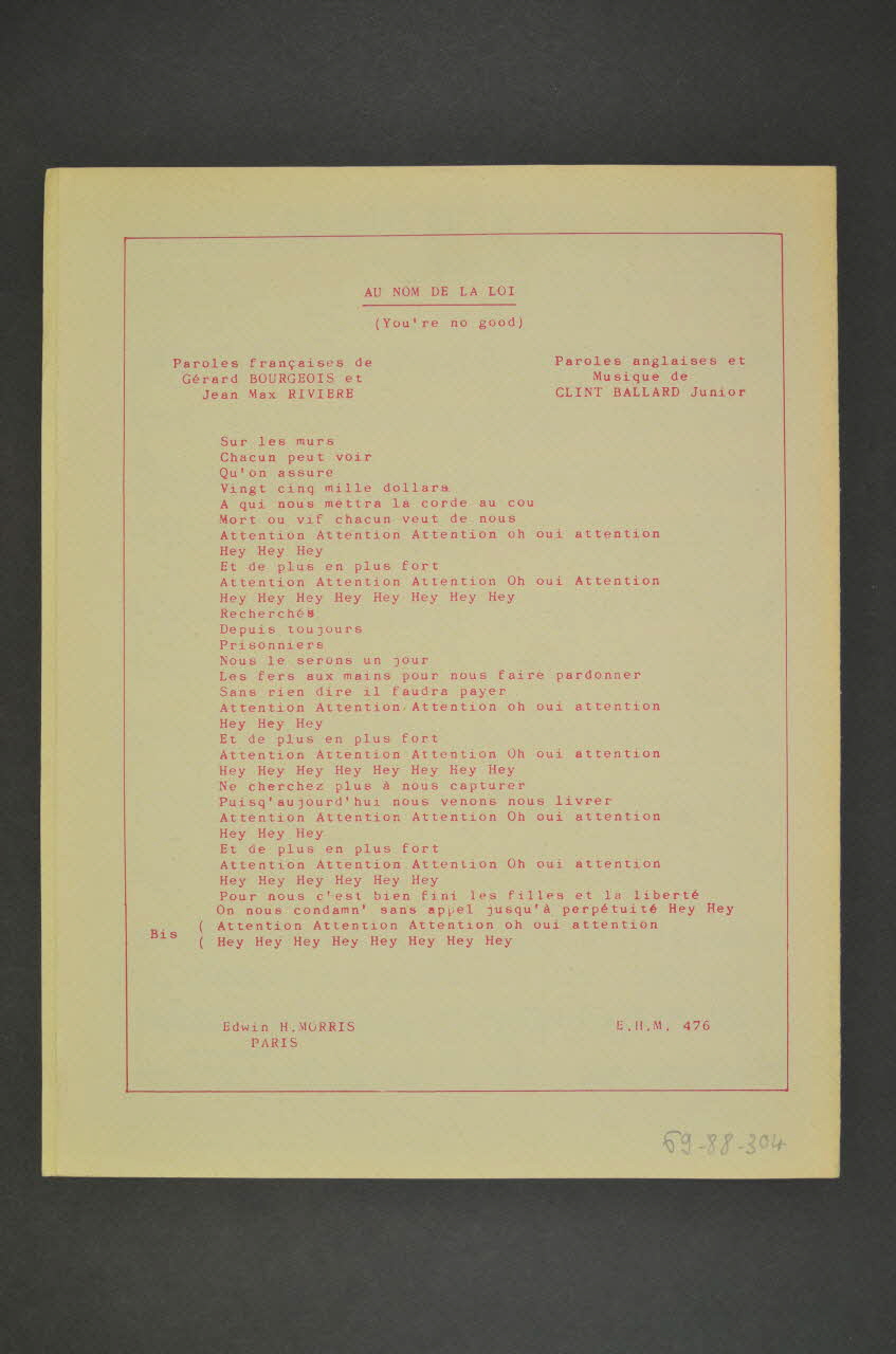 Des inscriptions renseignent le titre, les auteurs, les exécutants et l'éditeur. A l'intérieur, partition et paroles de la chanson. Au dos, les paroles.Matériaux et techniques