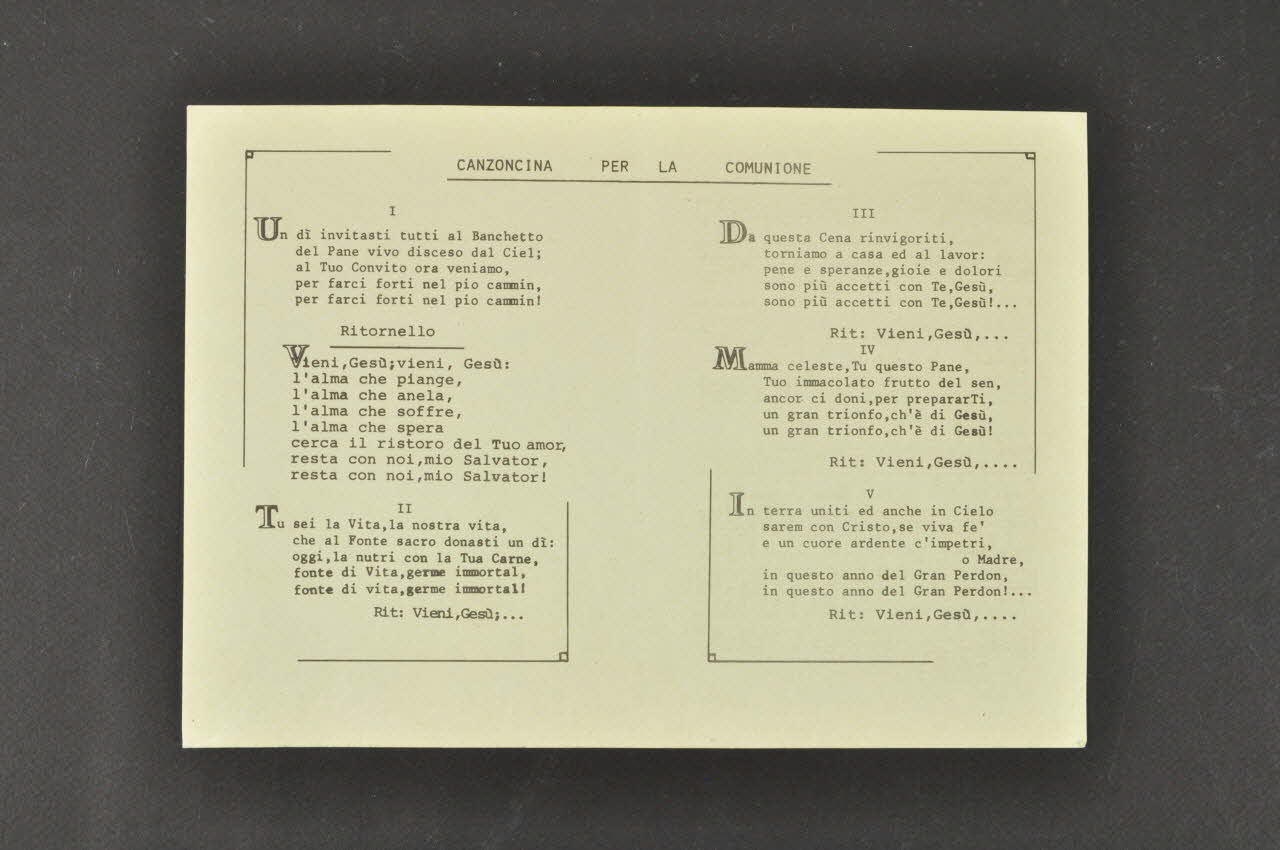 Impression des paroles et de la partition d'un cantique intitulé "Canzoncina per la comunione", composé à l'occasion des "rites" de 1975 dans les quartiers de Portella.Inscriptions