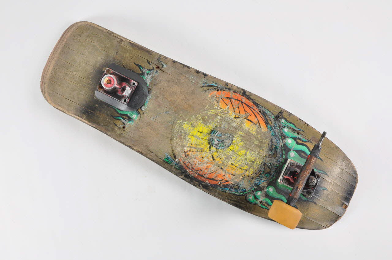 Lieu : Annecy, Haute-Savoie, Rhône-Alpes, FranceDate : 1988 - 1997Utilisateur : Lionel VenazioCette planche a servi essentiellement dans les skatepark. Les traces d'usure importante présentent sur la planche témoignent d'un usage intense et de haut niveau.