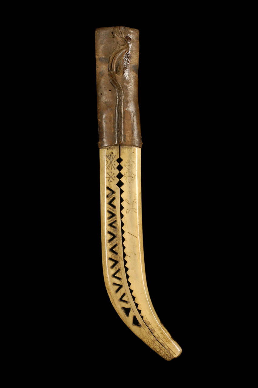 os sculpté et gravé, cuir / De forme légèrement recourbée à l'extrémité, la partie en os de ce fourreau est sculptée sur une face et présente des motifs géométriques gravés ou incisés sur l'autre. Il est recouvert de cuir dans sa partie haute. La partie en os, destinée à protéger la lame d'un couteau, est composée de deux parties clouées l'une à l'autre.Matériaux et techniques