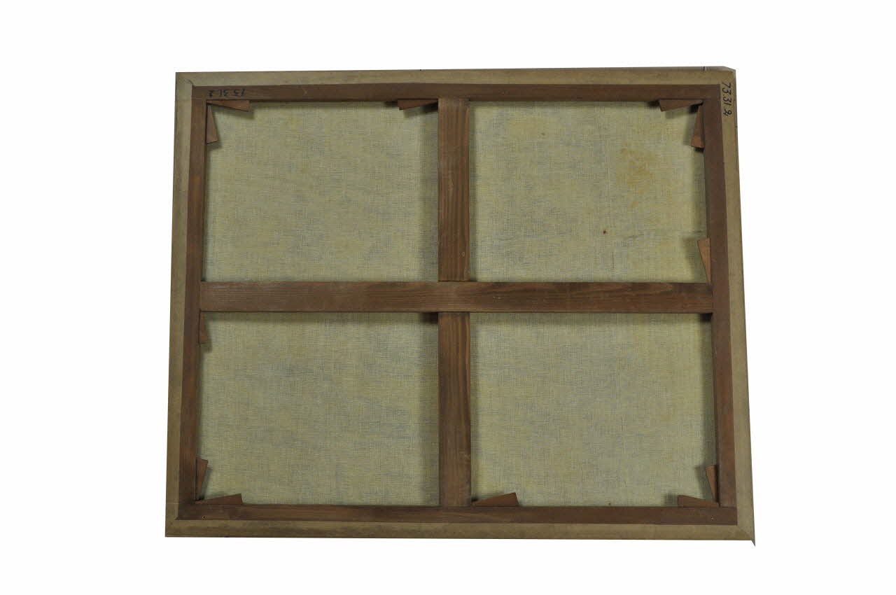 Cette huile sur toile de format rectangulaire est fixée sur un châssis à clés en bois, chanfreiné et fixé avec des semences. Le chassis est doté de deux traverses centrales.