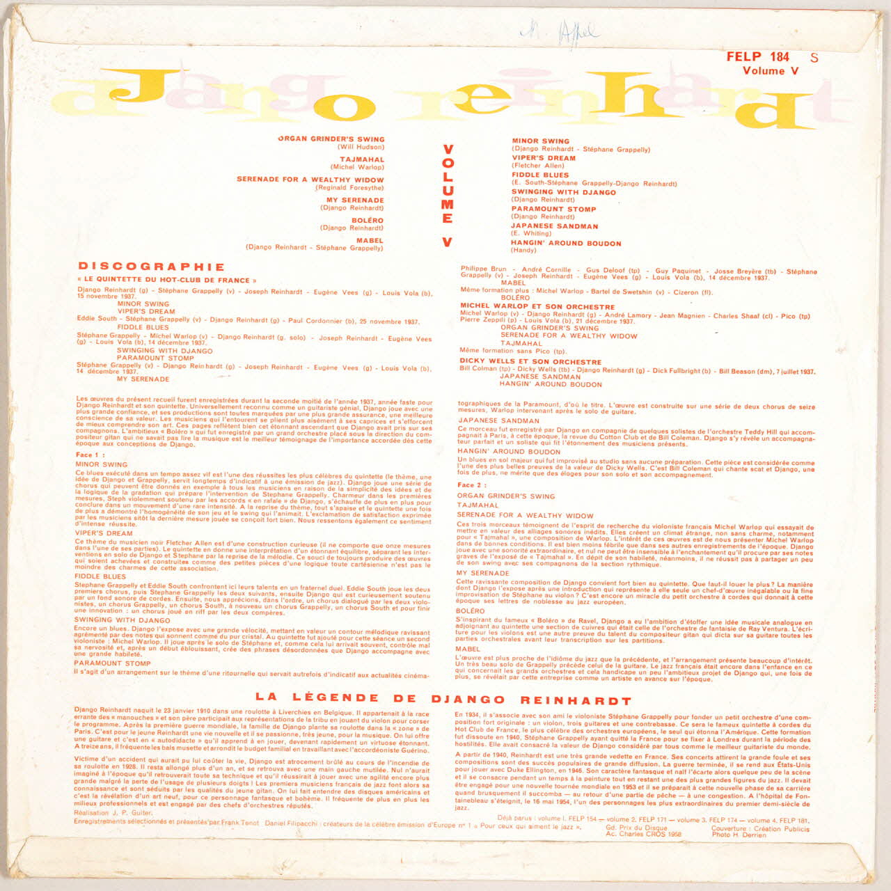 disque 33 tours, Boléro, Swinging with Django, Tajmahal, Mabel, Viper's dream, Organ Grinder's swing, Paramount Stomp, Hangin' around Boudon, Minor swing, Serenade for a wealthy widow, Fiddle blues, Japanese bandman, My serenade