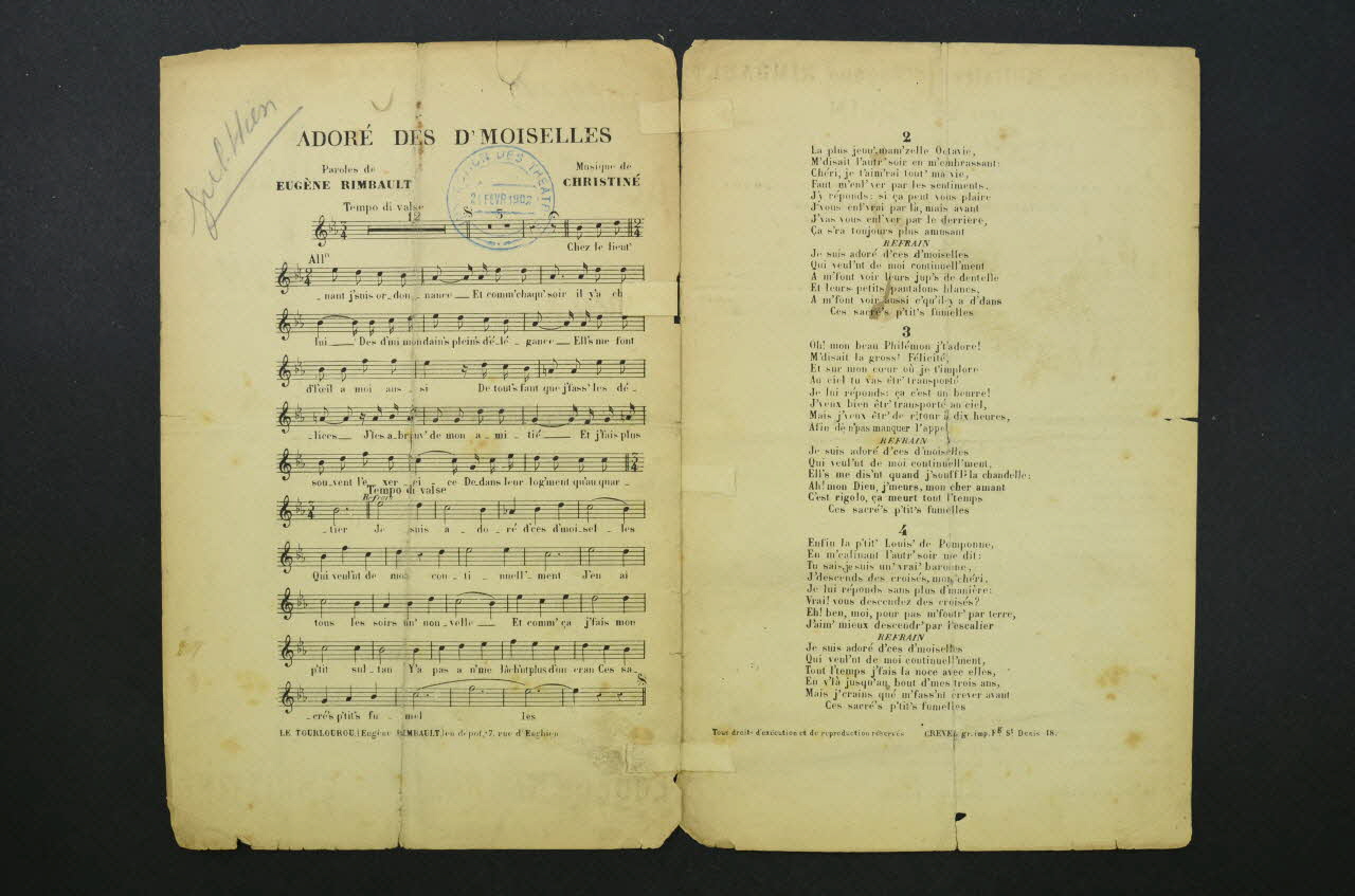 INSPECTION DES THEATRES // 21 FEVR 1902 (Dans la partie supérieure droite de la deuxième page, sous le titre, un tampon administratif circulaire à l'encre bleue.)Matériaux et techniques
