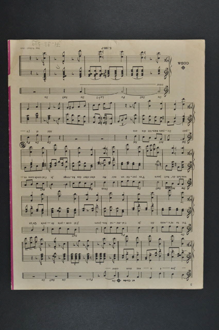Des inscriptions renseignent le titre, les auteurs, les exécutants et l'éditeur. A l'intérieur et au dos, partition et paroles de la chanson.Matériaux et techniques