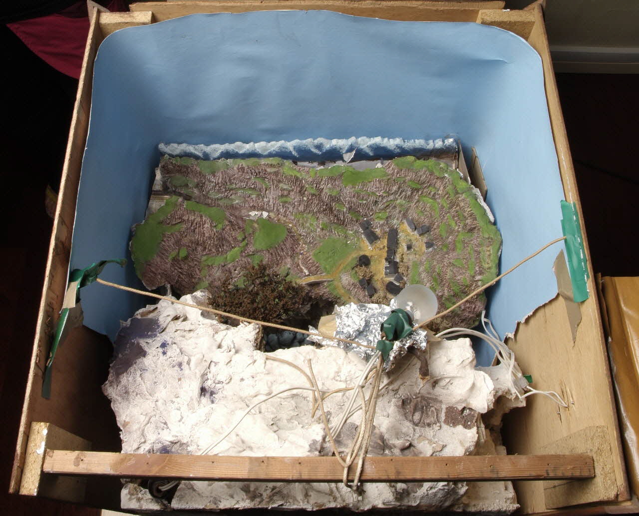Diorama placé dans une caisse rectangulaire en contre-plaqué, dont la face antérieure est vitrée.