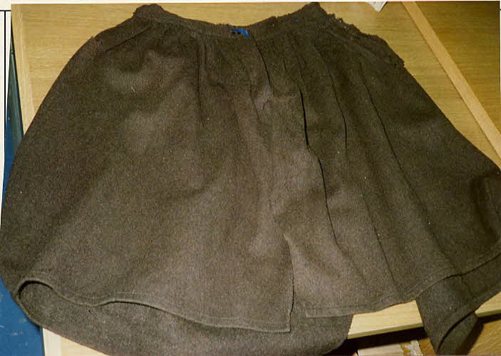 Pièce principale en laine teintée; à renfort en toile de lin teintée; à boutons en corne tournée, ajourée. / Braguette ouverture simple, fronces verticales.Matériaux et techniques