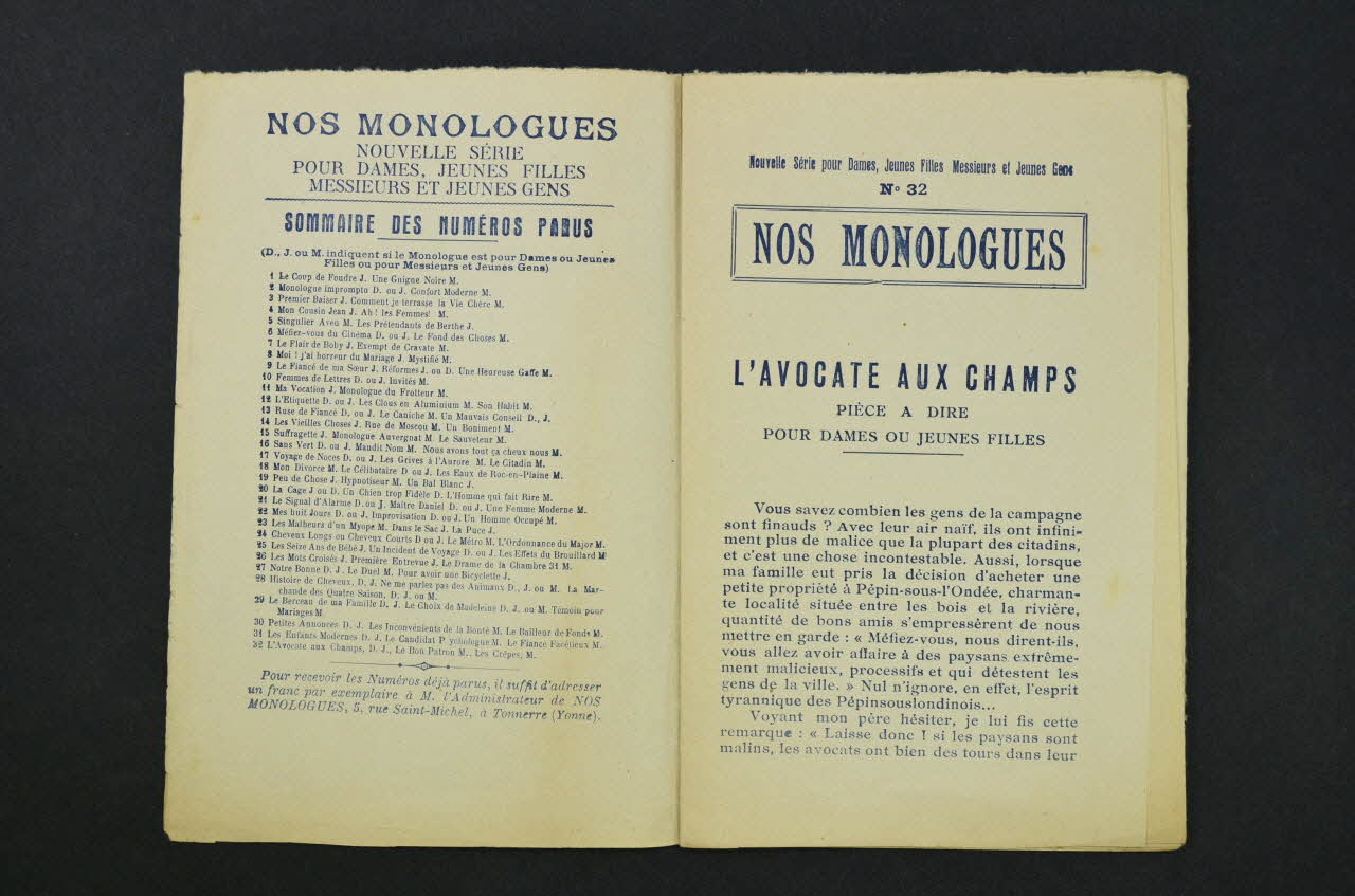 Sur la couverture, dans un encadrement à motifs de résilles, les inscriptions renseignent le titre de la publication, le nom de l'éditeur et le sommaire. A l'intérieur, textes de monologues. Sur la deuxième page, le sommaire des numéros parus. Au dos, description de la nature de la publication "Nos Monologues".Matériaux et techniques