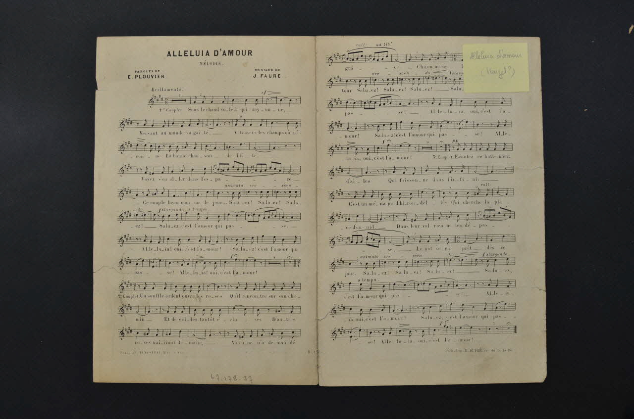 Les inscriptions précisent l'auteur de la chanson, les interprètes et l'éditeur du feuillet. L'intérieur comporte la partition et les paroles. Le dos est laissé vierge.Matériaux et techniques