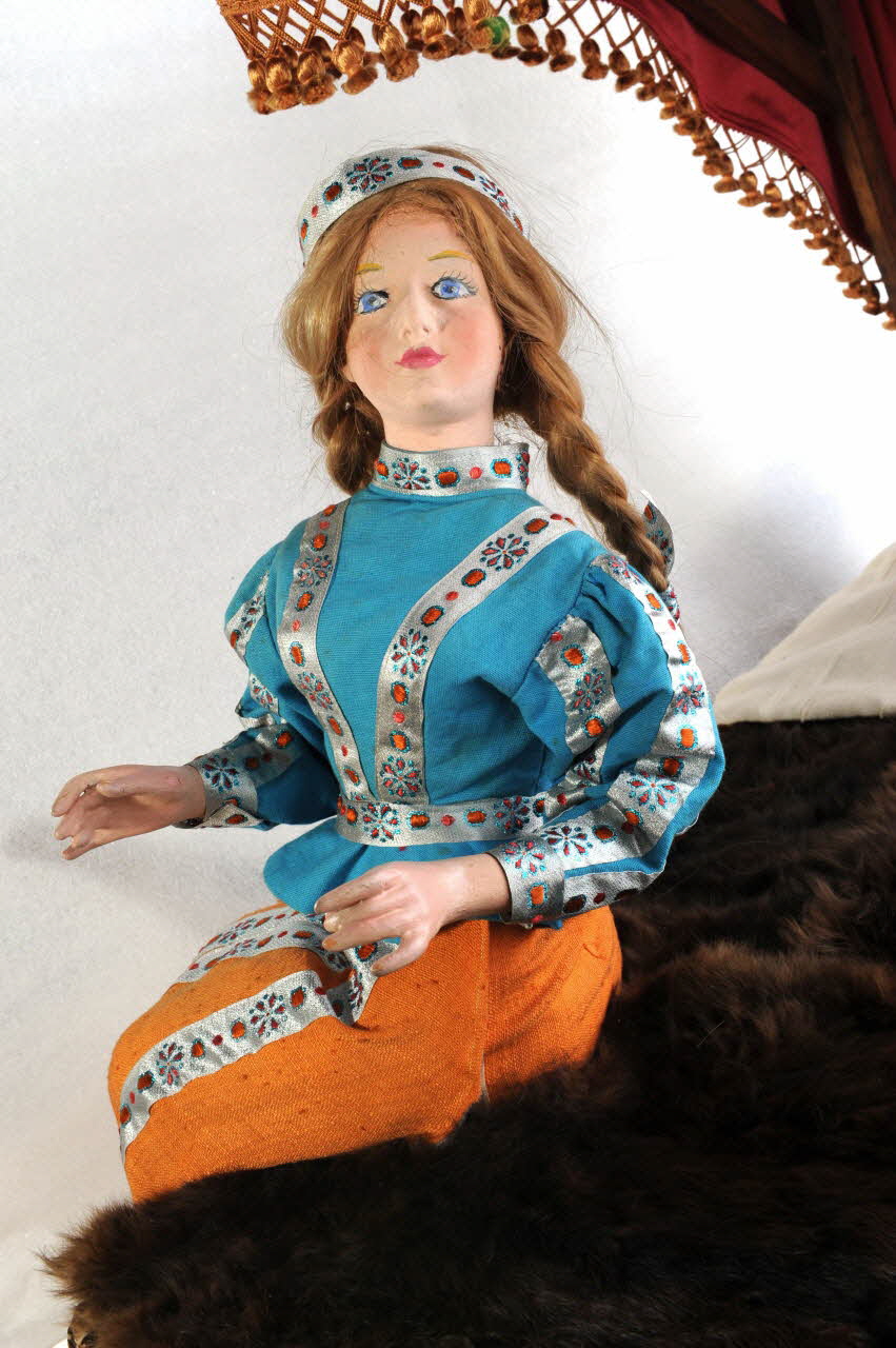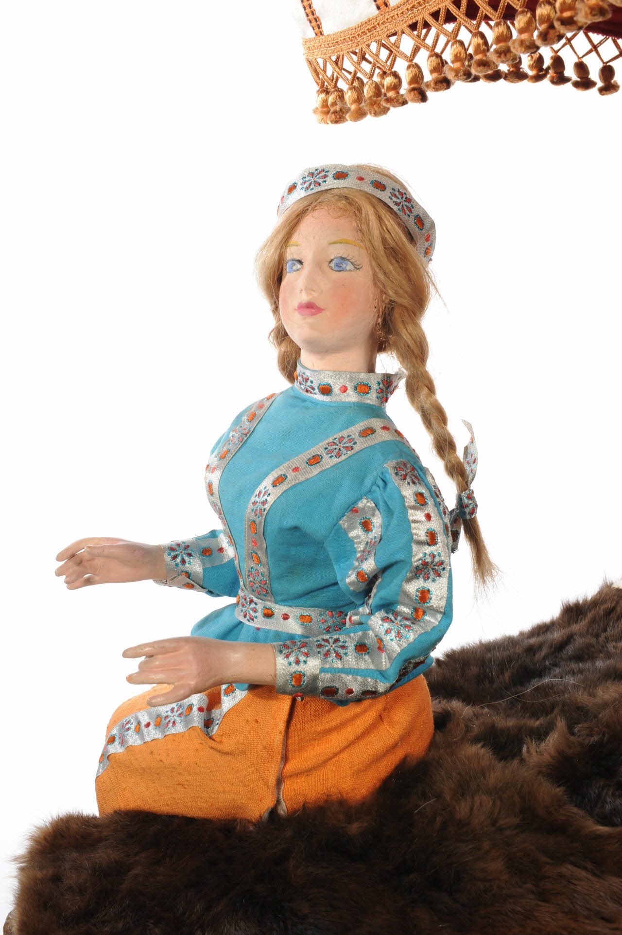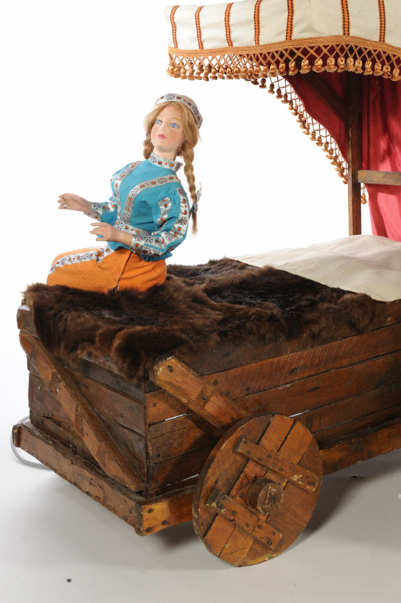 La reine est assise au bord d'un lit à baldaquin recouvert d'une fourrure. L'ensemble forme un char.Décor