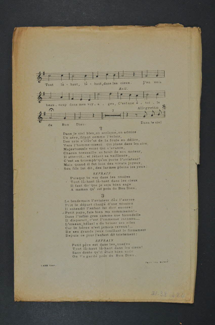 Feuillet rectangulaire en papier industriel imprimé à l'encre noire. Sur la couverture (qui est inversée par rapport au dos), inscriptions renseignent le titre, les auteurs et l'éditeur. Au dessous et au dos, partition et paroles.