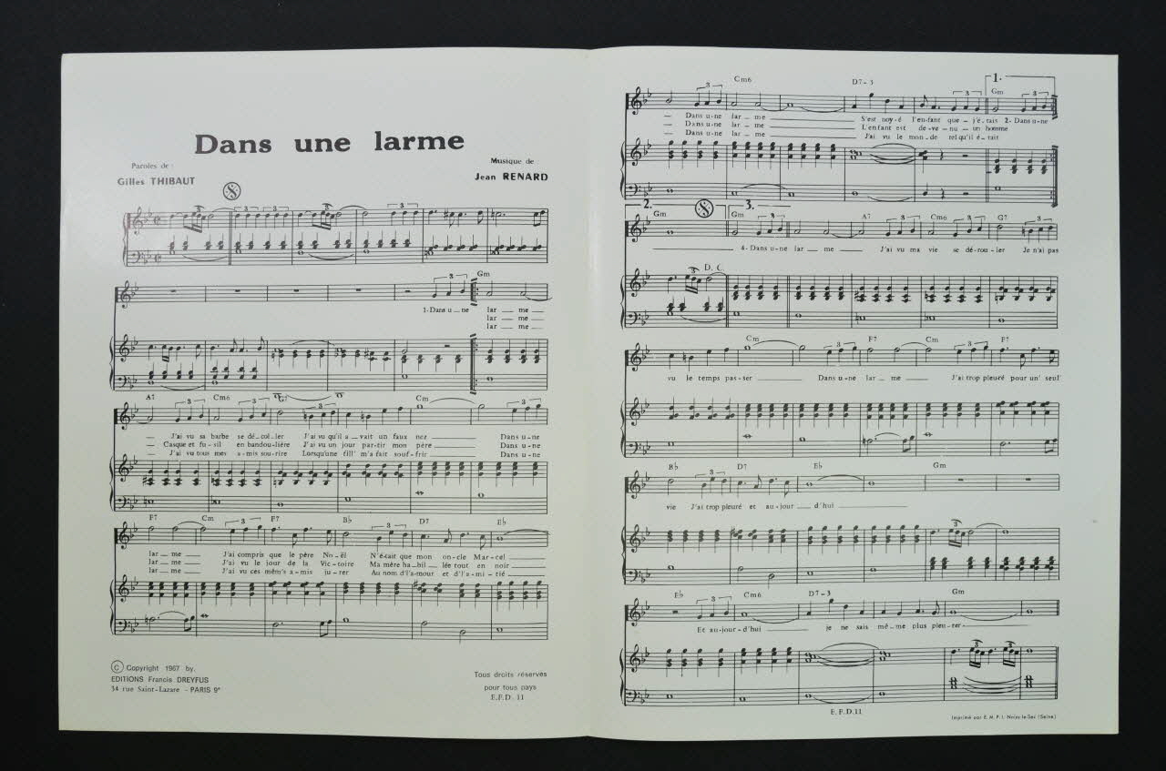 Sur la couverture, encadrement ornemental : porte stylisée avec motifs de rinceaux et éléments végétaux, flanquée de deux réverbères montés l'un sur une théière et une cage à oiseau (gauche), l'autre sur un villebrequin garni de feuilles (droite). Les inscriptions renseignent le titre de la chanson, le nom des auteurs, de l'artiste et de l'éditeur.
