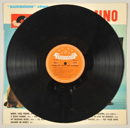 disque en vinyle / pochette en carton / au recto de la pochette, photographie d'un chien portant des lunettes et une réplique de chapeau de grande école, une patte posée sur une pile de livres - en face de lui, un tableau noir et une mappemonde - titre de l'album au dessus de la photo et titre des chansons en dessous - au verso de la pochette, titre des chansons, texte sur fond jaune sur la carrière de Fats Domino et en dessous photographie de quatre albums de l'artiste / disque en vinyle de couleur noir - partie centrale en rouge, noir et blancInscriptions