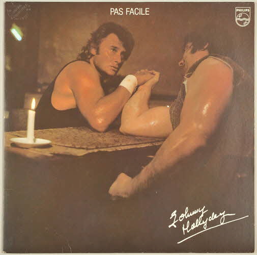 disque en vinyle de couleur noire / pochette / enveloppe de protection en papier blanc / photographie de Johnny Hallyday faisant un bras de fer contre un homme au recto de la pochette et contre une femme au verso de la pochette - détails du disque imprimés sur l'enveloppe de protection / inscriptions grises sur fond noir sur partie centrale du disqueInscriptions