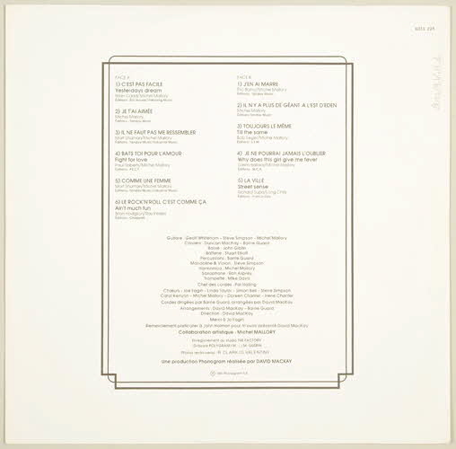 De : Lieu : FranceDate : 1981gravure / guitare // mandoline // violon / guitare / basse / gravure / arrangements / collaboration artistique // auteur-compositeur // guitare // harmonica // choeur / claviers / direction des cordes // percussions // claviers // arrangements / batterie / enregistrement au studio The Factory / maison de disques