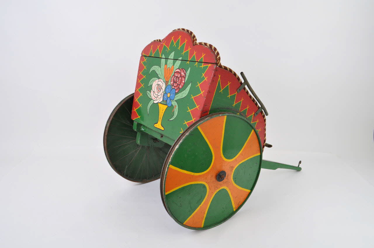 Sujet de manère figurant un pousse-pousse, en bois taillé, fixé et peint et complété de roues en fer martelé.