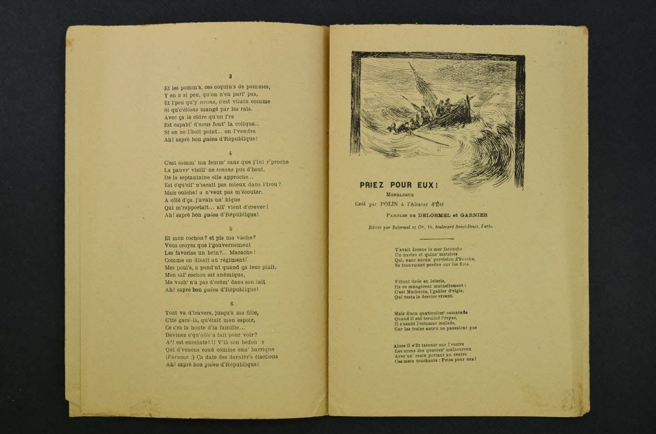 A l'intérieur, partitions et paroles de chansons avec différentes illustrations : paysan désignant sa main ; bateau en perdition ; veuve de marin priant devant le rescapé Mathurin ; homme poisson coiffé d'une toque et amoureux sur un banc au clair de lune ; jeune femme les mains dans les poches de son tablier ; marquis désignant un panneau ; marquis attablé avec un homme devant un bock.