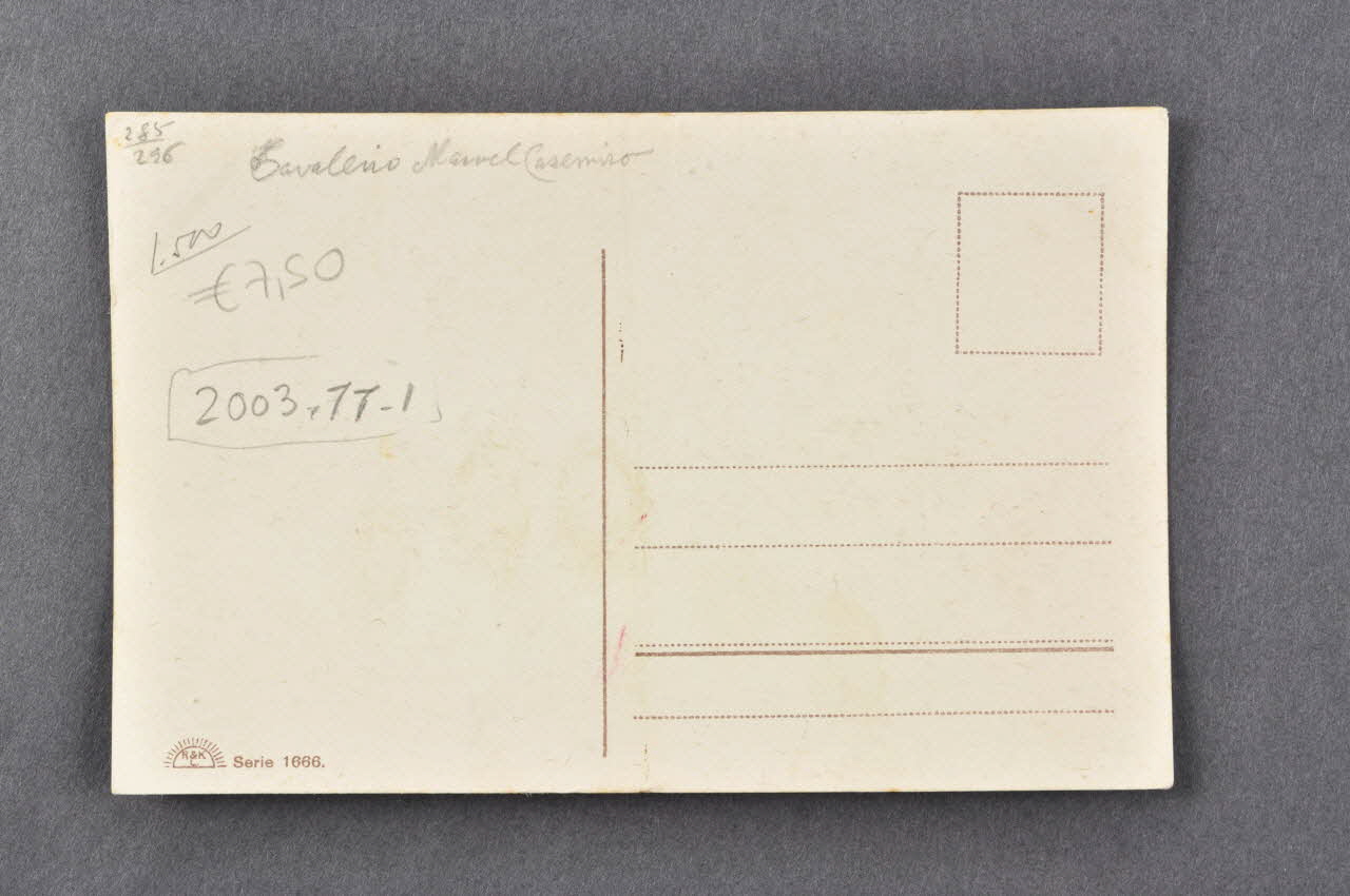 En papier cartonné, ornée sur la face d'une photographie coloriée, présentant un homme à cheval, dans une arène, saluant la foule. Des inscriptions manuscrites figurent au dos.Inscriptions
