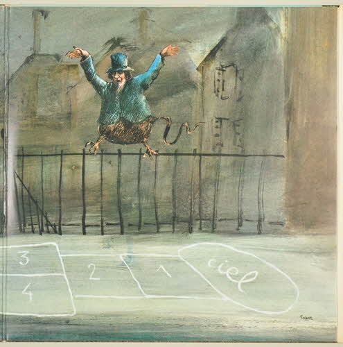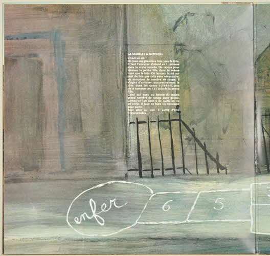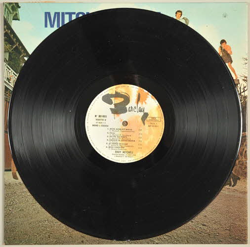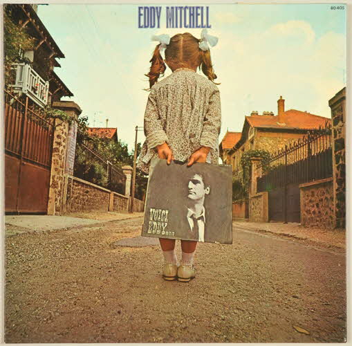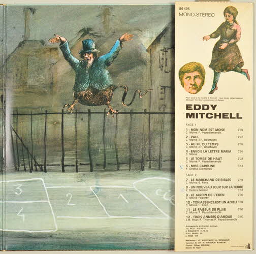 disque en vinyle de couleur noire / pochette en carton / au recto de la pochette, photographie d'une fillette, vue de dos dans une rue bordée de maisons, tenant un album d'Eddy Mitchell : "Voici Eddy..." sorti en 1963 - au verso de la pochette, photographie de la même fillette, de face portant le même album dans le dos, au même endroit mais peuplé de différents personnages représentés par Eddy Mitchell (un ange, un curé, un travesti, un vampire, etc) - à l'intérieur de la pochette, dessin représentant une marelle avec comme extrémités l'enfer d'un côté et le ciel de l'autre - la marelle est surmontée d'un personnage imaginaire - un texte intitulé "La marelle à Mitchell" indique comment jouer - sur la partie droite de la pochette, un rabat comprend deux éléments "à découper" pour jouer à savoir le dessin d'une tête (celle d'Eddy Mitchell) et celui d'une petite fille - le rabat contient aussi le nom des chansons et le nom des participants (arrangeurs, direction musicale, ingénieur du son, photographies, etc.) - sorte d'intercalaire au dessus du rabat indiquant la référence de l'album et le nom de la maison de disques / disque vinyle de couleur noir - motif dans les tons de jaune et orange et signature spécifique de la maison BarclayInscriptions