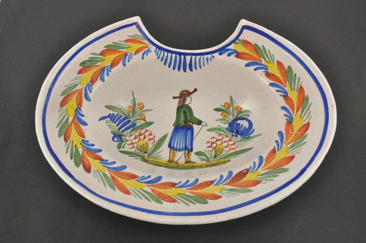 Sur fond ovale, à hauts bords et un large marli avec une encoche sur un côté. Décor peint sur fond blanc représentant un personnage de profil portant un chapeau et tenant une canne de la main droite. De part et d'autre des plantes. Sur le marli, un décor des feuillages multicolores (bleu, orange, jaune et vert) encadrés par un filet bleu. Sur le pied du plat, deux perforations.Décor