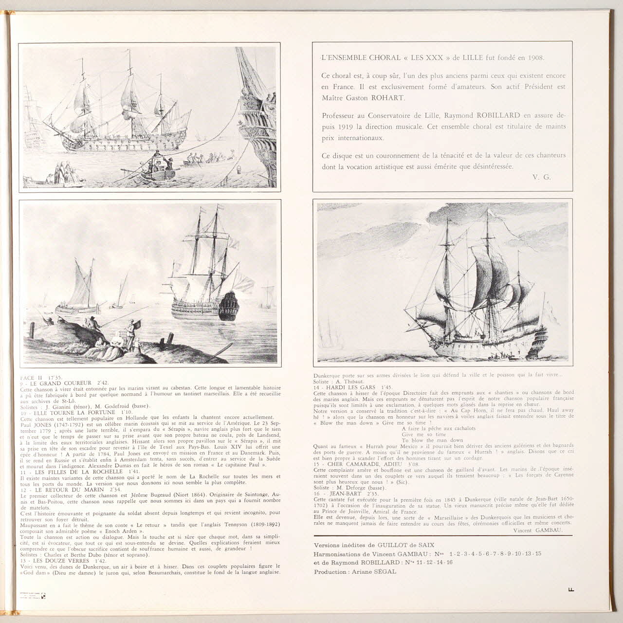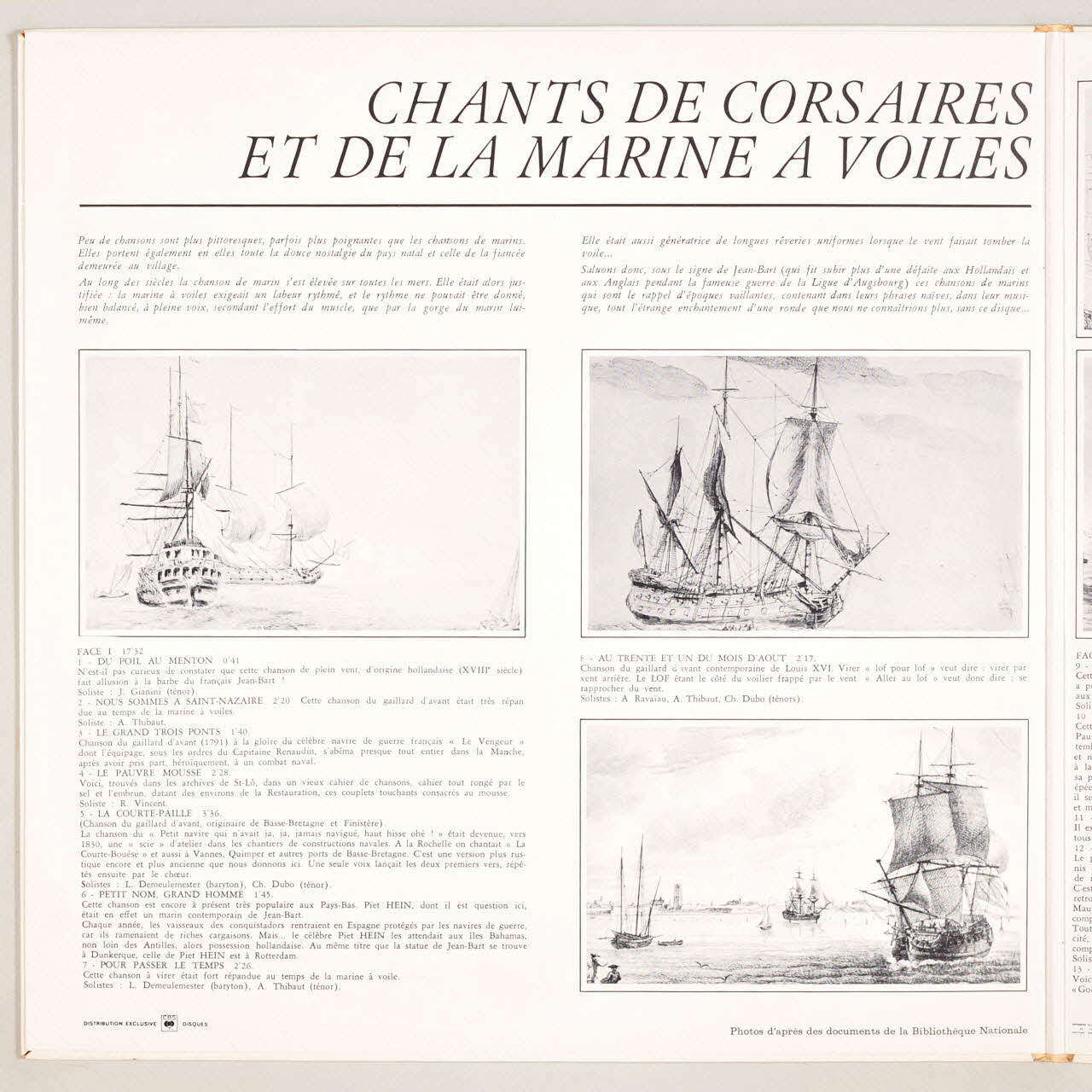 Au verso, un dessin noir et blanc représentant un vaisseau à voiles près duquel se détache une petite embarcation à rames. Des inscriptions sur les deux faces de la pochette et sur l'étiquette verte du disque renseignent les titres et les exécutants de l'album. A l'intérieur de la pochette, un texte explicatif et des dessins de voiliers accompagne chaque chanson.Matériaux et techniques