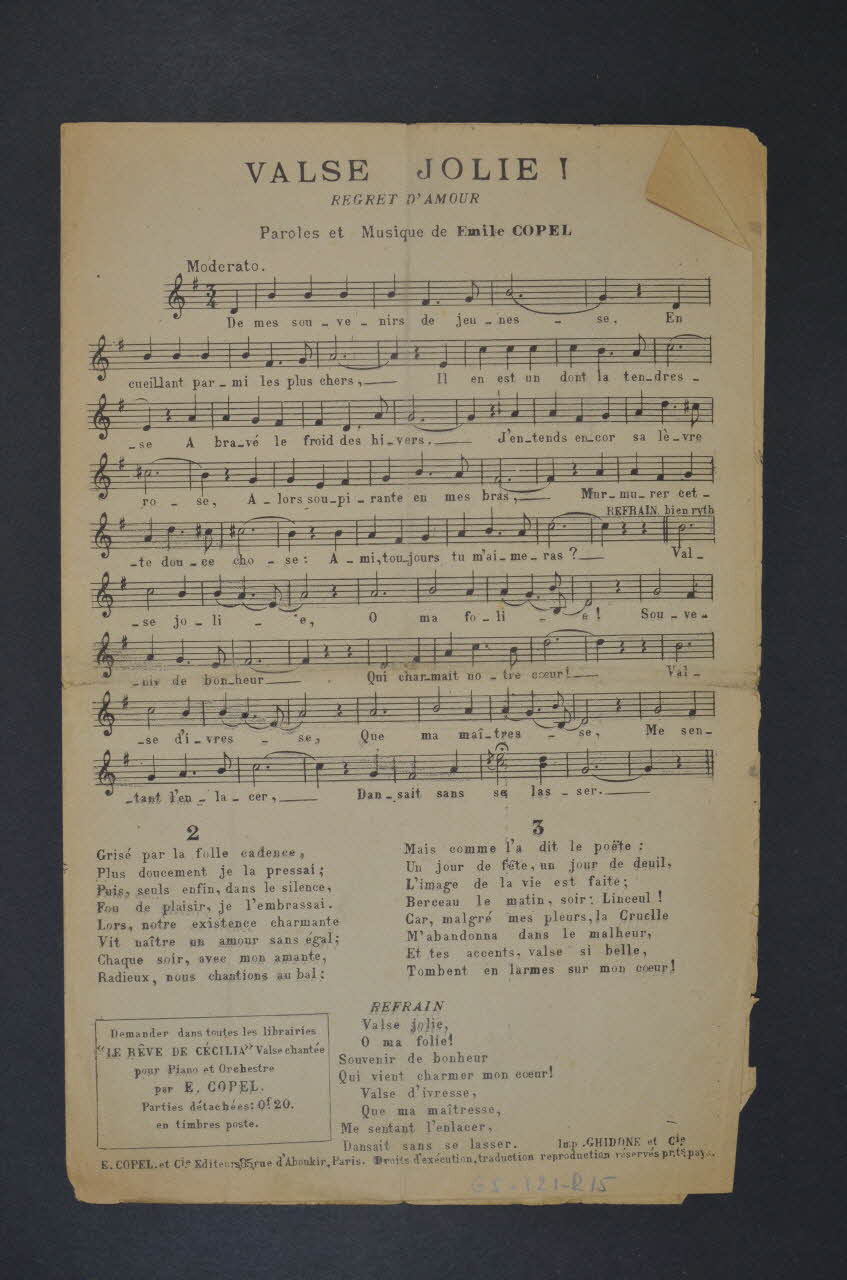 Les inscriptions renseignent le titre de la chanson, le nom des auteurs, de l'artiste et de l'éditeur. Au dos, partition et paroles de la chanson. L'intérieur est laissé vierge.Décor