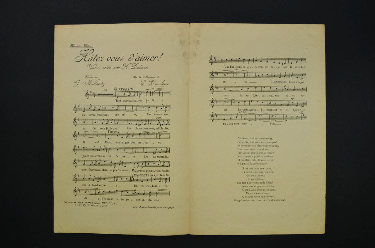 Les inscriptions renseignent le titre de la chanson, le nom des auteurs, de l'artiste et de l'éditeur. A l'intérieur, partitions et paroles de la chanson. Au dos, liste d?autres partitions publiées par l?éditeur.Décor