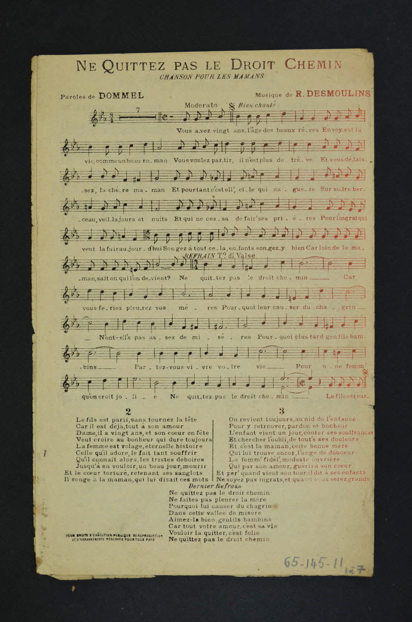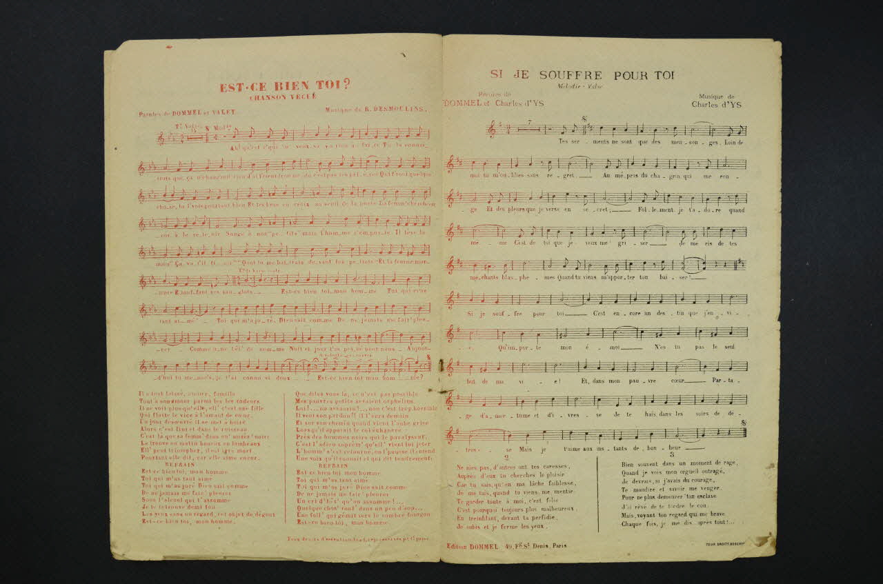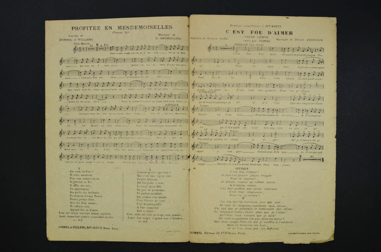 De : Date : 1920Si je souffre pour toi / Est-ce bien toi? / Profitez en mesdemoiselles // Est-ce bien toi // Les mots d'amour // Ne quittez pas le droit chemin / Profitez en mesdemoiselles // Les mots d'amour / Profitez en mesdemoiselles // Est-ce bien toi? // Si je souffre pour toi // Les mots d'amour // Ne quittez pas le droit chemin / C'est fou d'aimer / Petite poupée si jolie. / C'est fou d'aimer / 49 Fbg St Denis