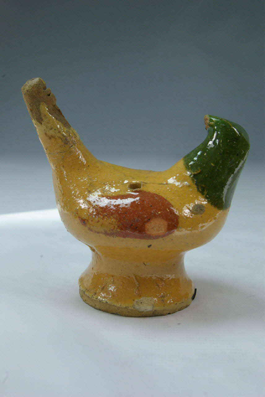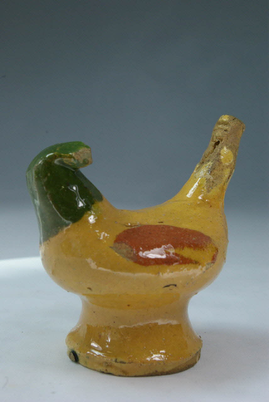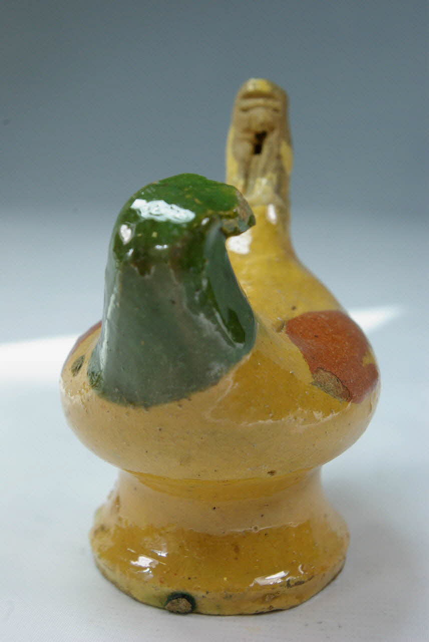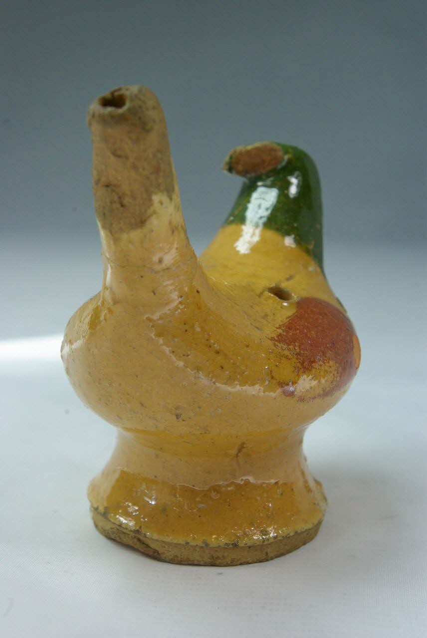 terre cuite tournée, modelée, émaillée glaçurée transparente / Une petite flûte tubulaire est insérée en biais dans le corps creux de cet oiseau posé sur piédouche à la place de la queue. La partie sifflante dépasse à l?extérieur avec la fenêtre ouverte sur le dessus. Le reste du tuyau plonge à l?intérieur du corps. Un trou permettant le remplissage d'eau et la modulation du son est ouvert sur le coté droit du dos. Un ajout d'argile étiré à l'avant forme la tête stylisée de l'oiseau qui est repliée vers l'arrière. Deux traits parallèles sont incisés entre l'embouchure et la fenêtre. Le piédouche est large et tronconique. La figurine est formée à partir d'un récipient tourné en terre beige puis refermé sur le haut et la flûte a été modelée dans la même terre. Les ailes sont recouvertes d'engobe marron et la tête et le cou d'engobe bleu-vert. L'ensemble de l'objet est couvert d'émail transparent, sauf sur le dessous et à l'extrémité du sifflet.Matériaux et techniques