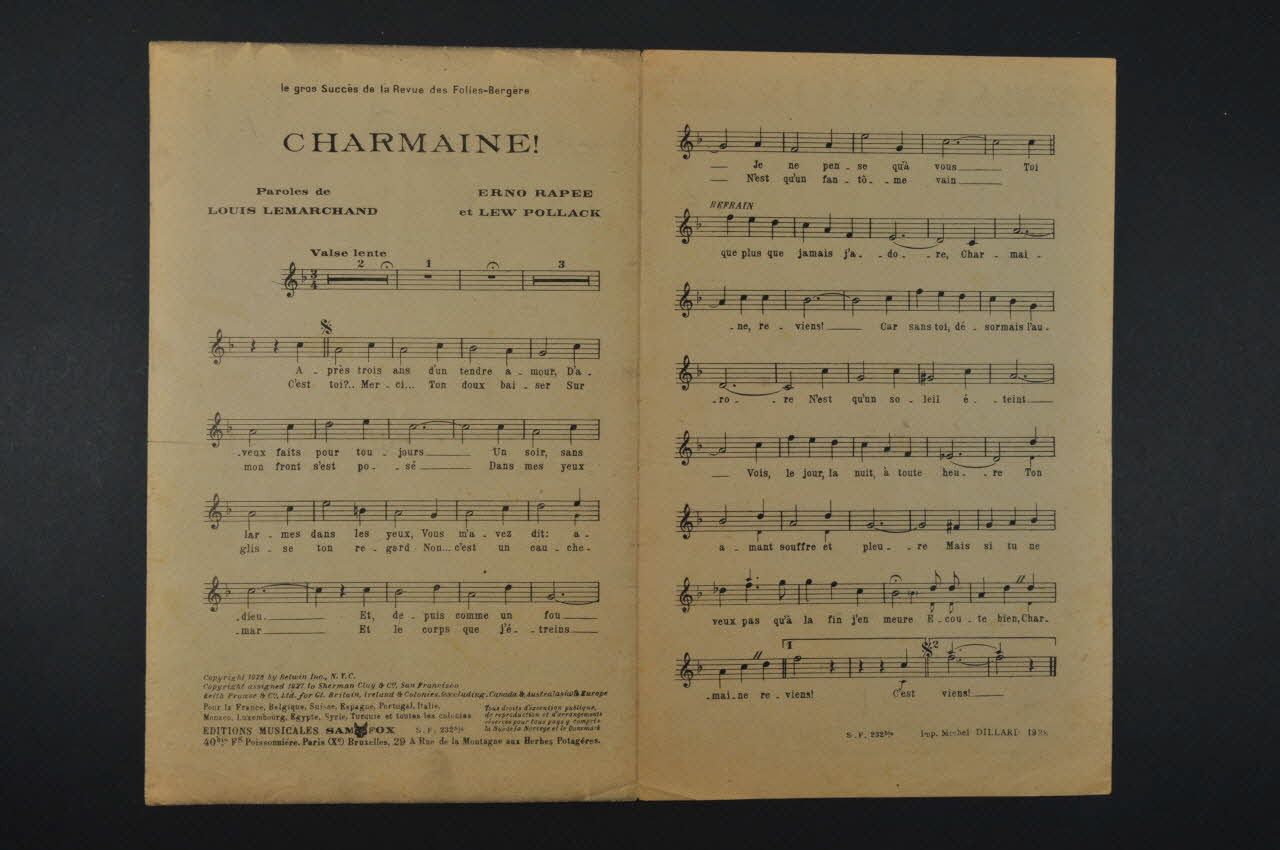 Des inscriptions renseignent le titre, les auteurs, les exécutants et l'éditeur. A l'intérieur, partition et paroles de la chanson. Au dos, publicité pour "La petite dame du train bleu".Décor