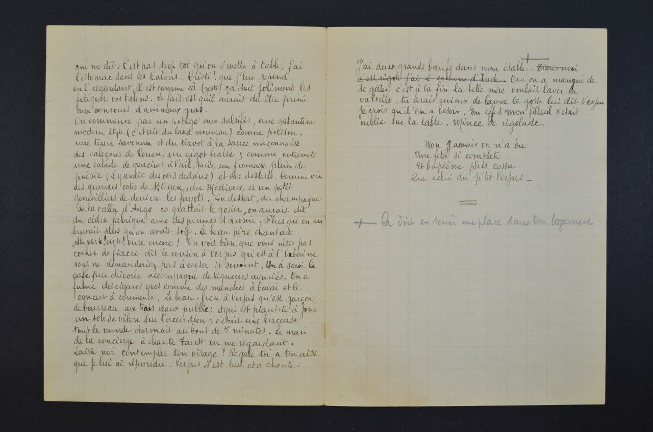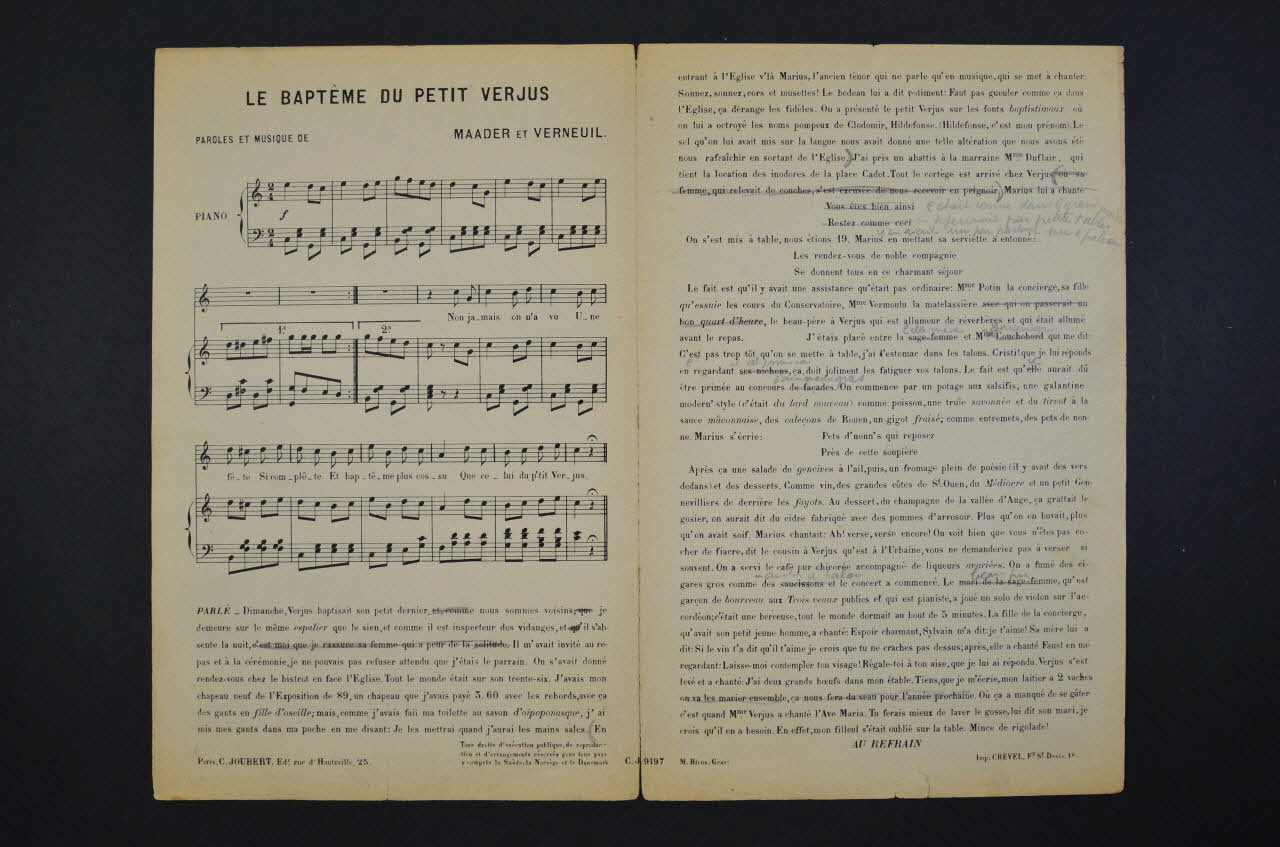 Les inscriptions précisent l'auteur de la chanson, les interprètes et l'éditeur du feuillet. L'intérieur comporte la partition et les paroles. Au dos, une liste d'autres titres disponibles chez le même éditeur. A l'intérieur du feuillet est glissé un feuillet manuscrit rédigé à l'encre noire comportant les paroles de la chanson.Décor