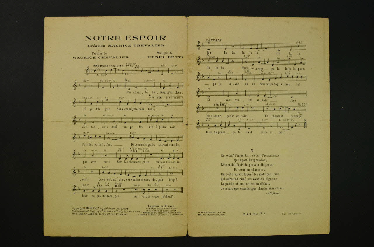 procédé d'imitation photomécanique bleue et blanc / Feuillet rectangulaire en papier industriel imprimé à l'encre. L'intérieur comporte les paroles et la partition de la chanson. Au dos, publicité pour l'éditeur