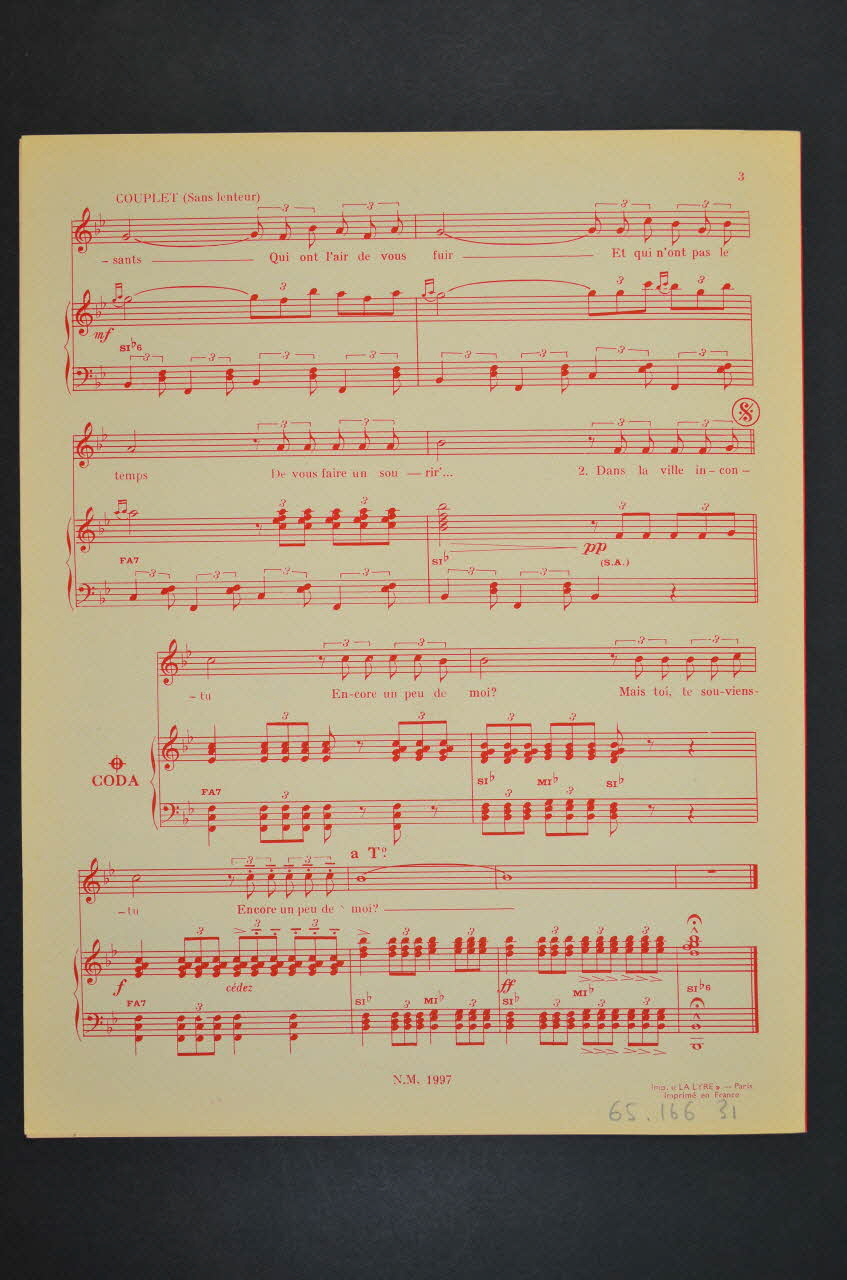 Feuillet rectangulaire en papier industriel imprimé à l'encre rouge et blanche (sauf à l'intérieur, encre noire). Sur la couverture, un portrait photographique de Piaf.