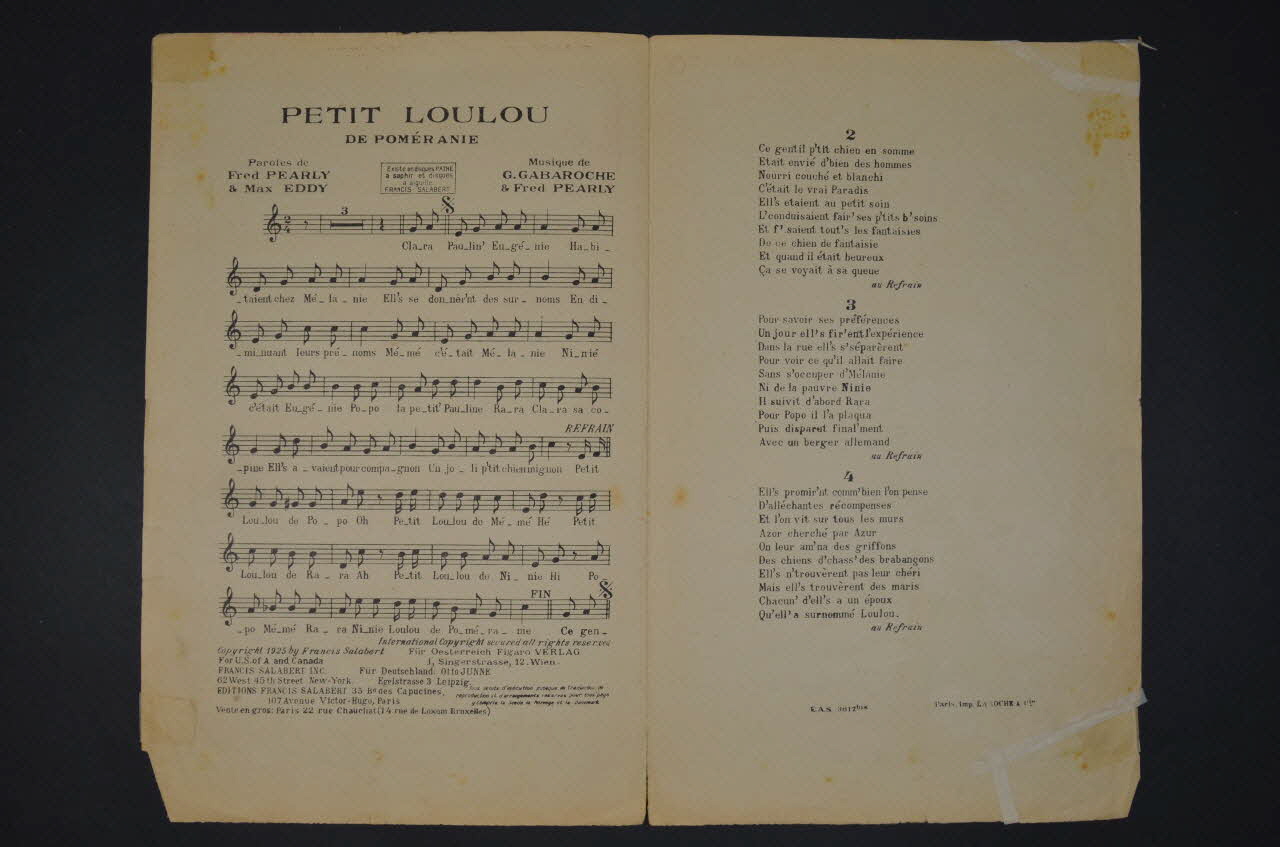 Sur la couverture, représentation d'un loulou de Poméranie accompagné de trois visages de jeunes femmes. Les inscriptions renseignent le titre de la chanson, le nom des auteurs, de l'artiste et de l'éditeur.