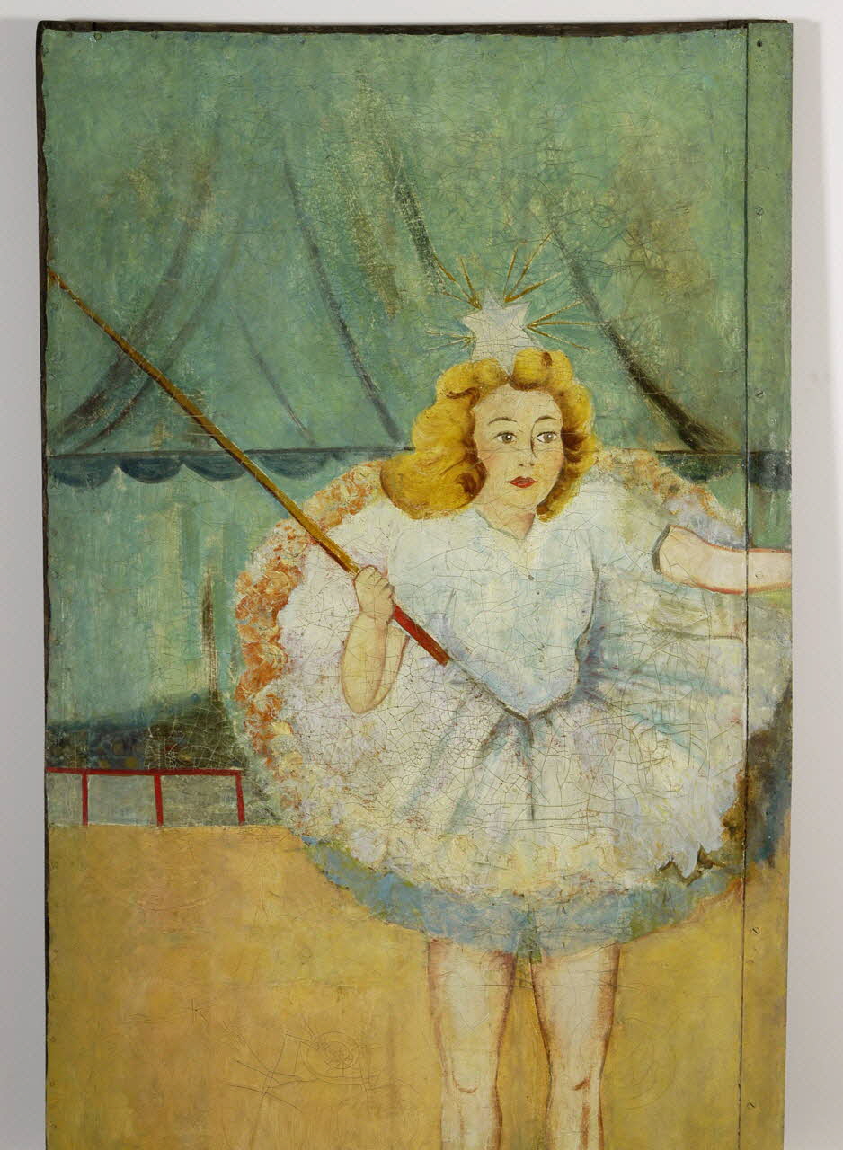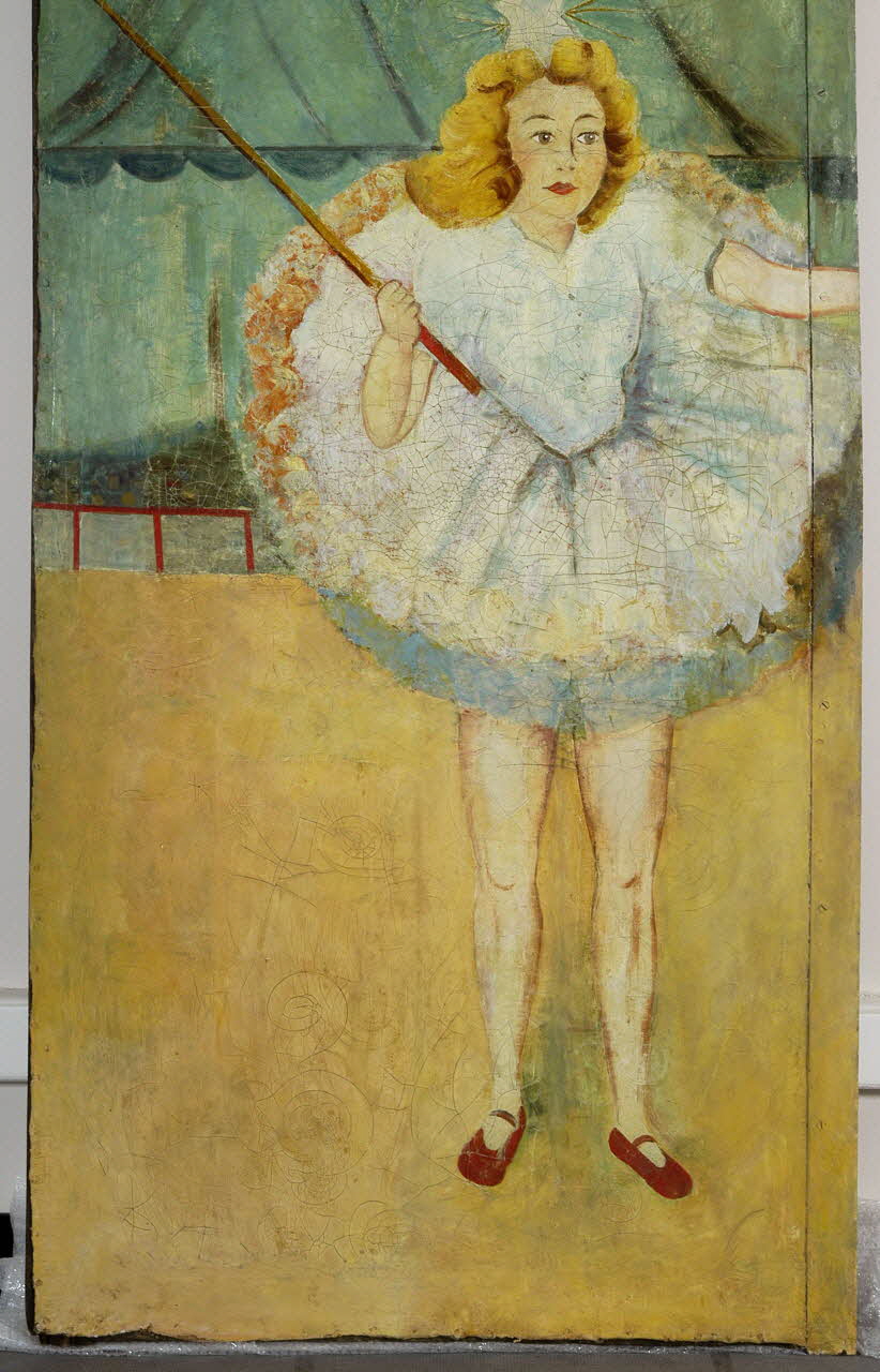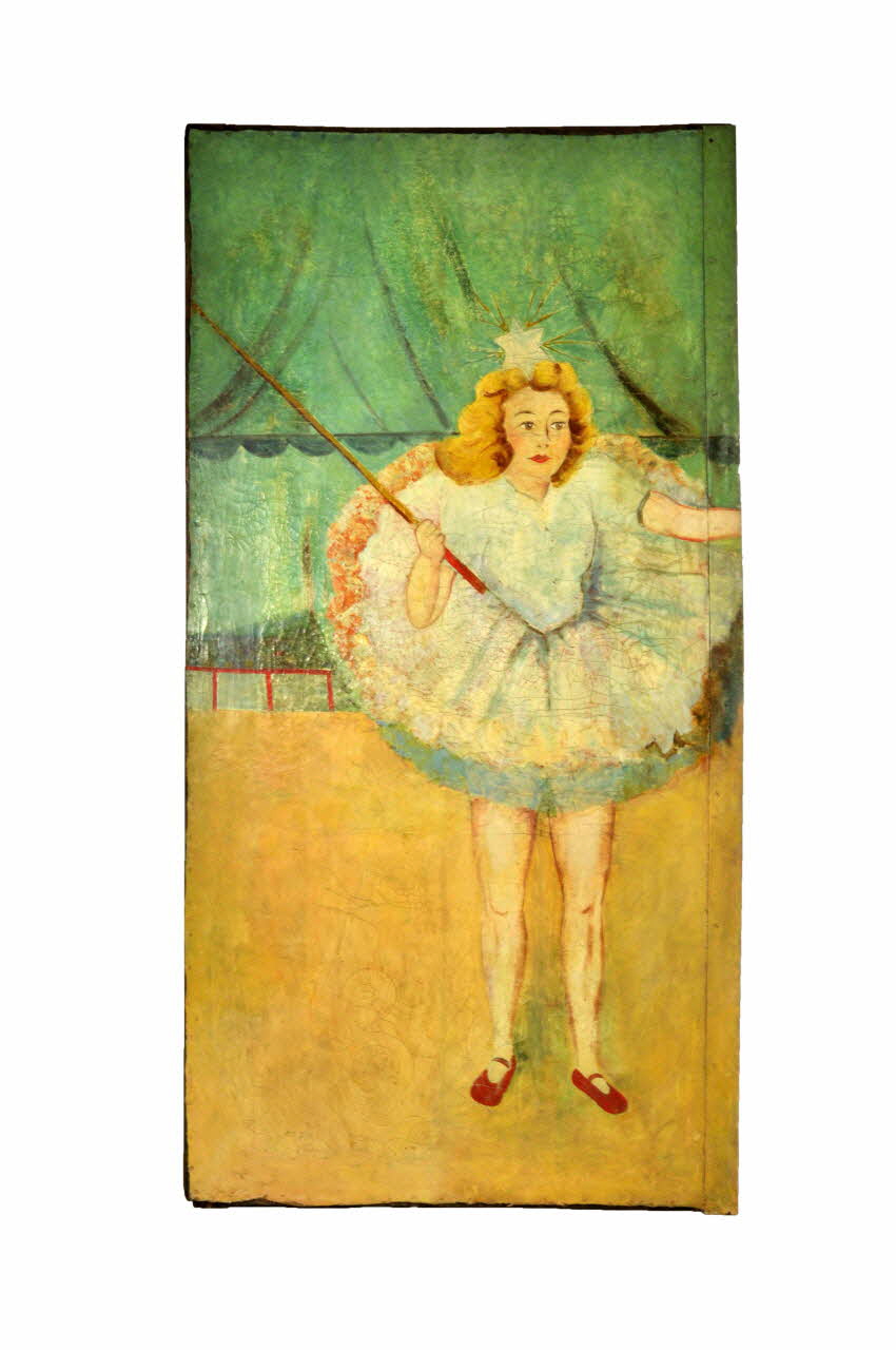 Elle se plaçait entre les toiles 1960.73.3 et 1960.73.5. On note que le bord droit est contitué d'une plaque de fer sur laquel le décor peint se poursuit. Au revers, dans les angles et au niveau des deux barres transversales, des plaques de tôle triangulaires peintes en rouge sont clouées. Un système d'accrochage à deux crochets noirs est visible en partie supérieure du revers. Le décor peint représente une tente de cirque verte, avec une arène au sol jaune. Une balustrade rouge et blanche sépare l'arène du reste. Au centre est représenté un personnage en pied : une jeune femme vêtue d'un tutu blanc, portant un étoile dans les cheveux et chaussée de ballerines rouges. Elle tient un un long fouet dont l'extrémité est visible sur la toile .3.Inscriptions