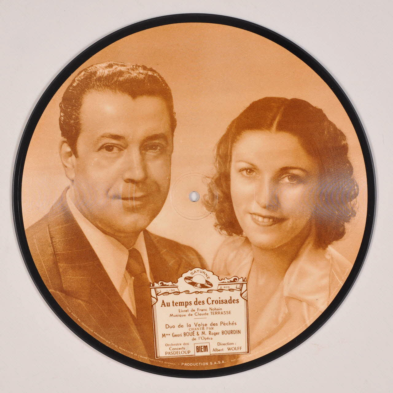 Le disque est décoré sur ces deux faces d'une impression colorée. Sur une des faces, une photographie sépia d'un homme en costume et cravate et d'une femme portant un chemisier blanc, souriant.