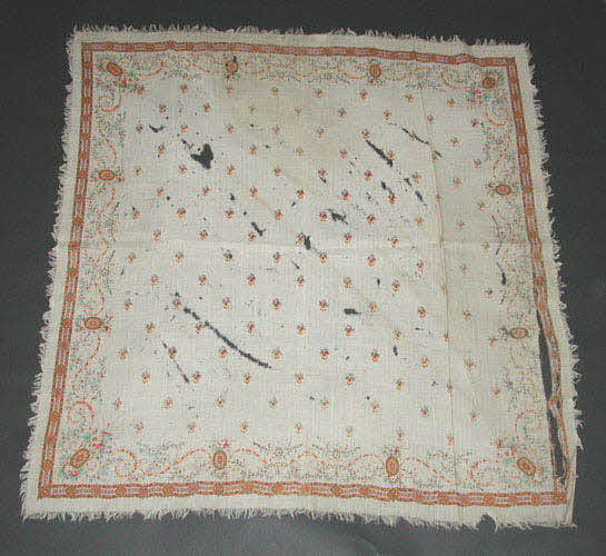 Carré de flanelle écrue avec motif polychrome impressionné sur une face. Motifs floraux encadrés par des rinceaux et pierreries, et cadre géométrique avec motif trilobé.Matériaux et techniques