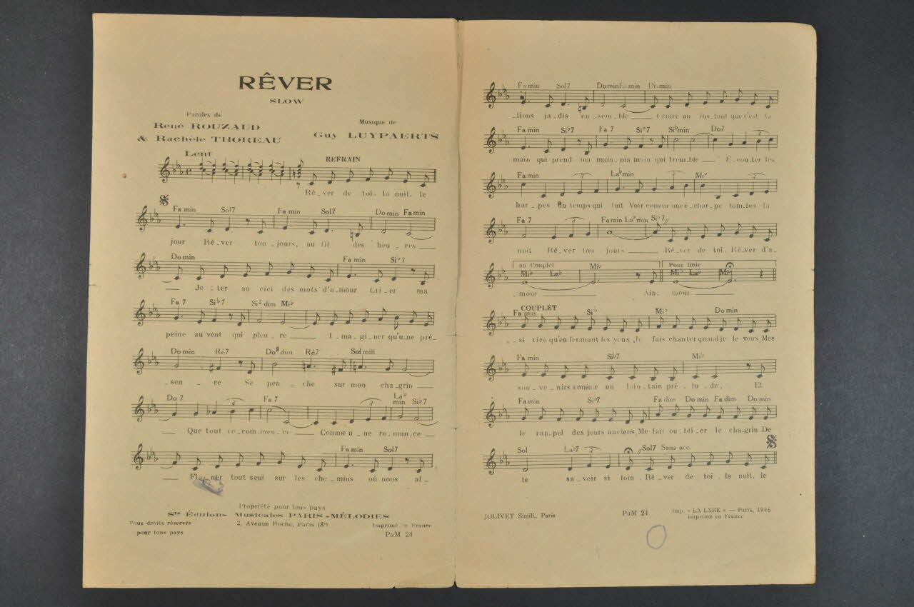 Des inscriptions renseignent le titre, les auteurs, les exécutants et l'éditeur. A l'intérieur, partition et paroles de la chanson. Au dos, liste d'autres partitions publiées par l'éditeur.Décor