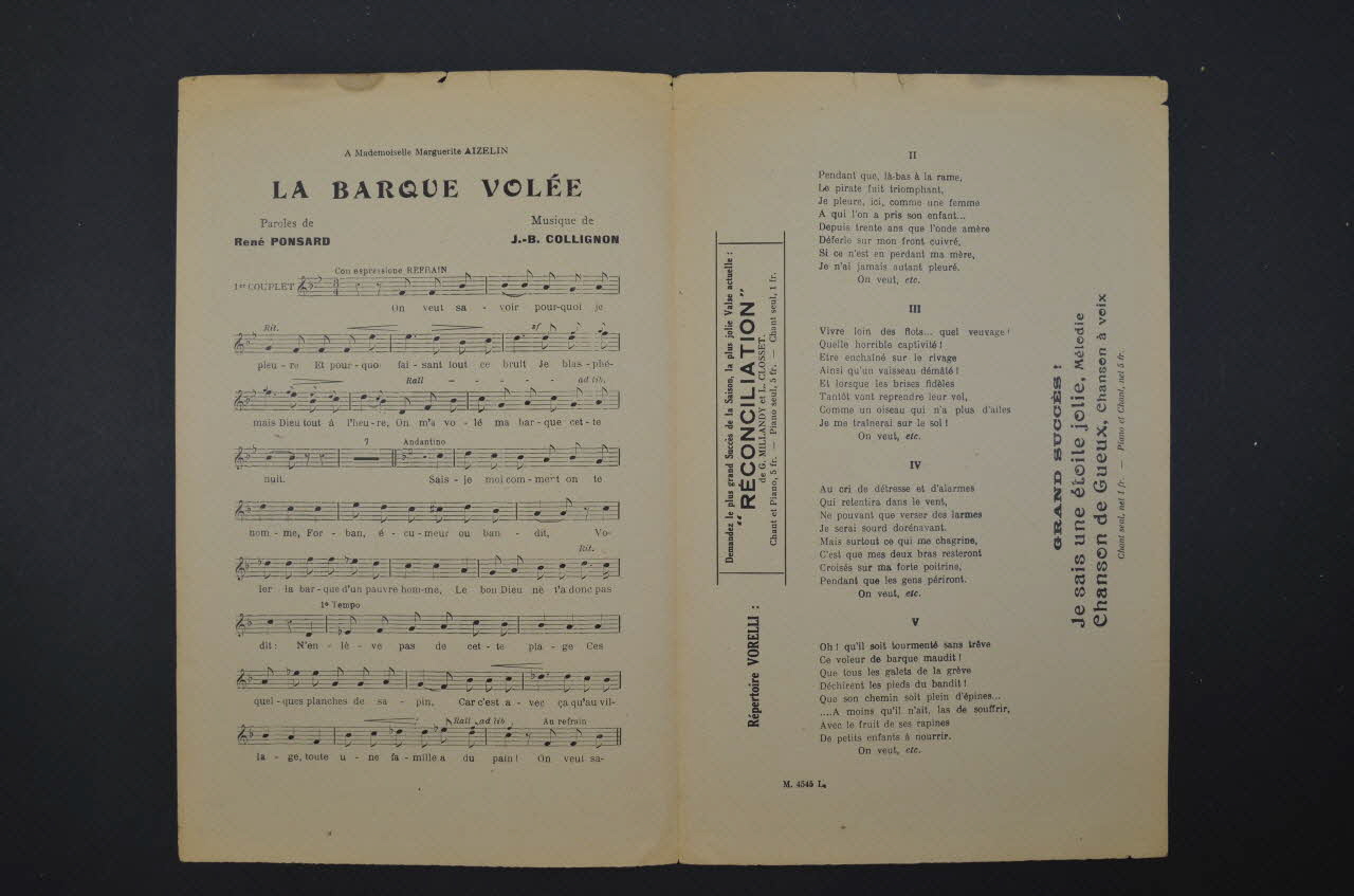 Feuillet rectangulaire en papier industriel imprimé. Le feuillet contient la partition et les paroles de la chanson. Au, dos, publicité pour l'éditeur.