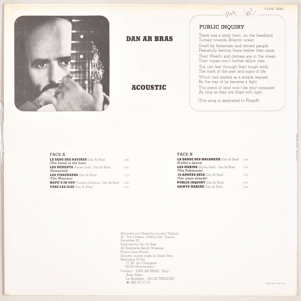 disque 33 tours, Hope's in you, Public inquiry, Le sang des navires, Vers les îles, Les marins, Acoustic, Sainte Marine, La danse des macareux, Les déments, Dix années déjà, Les tisserands