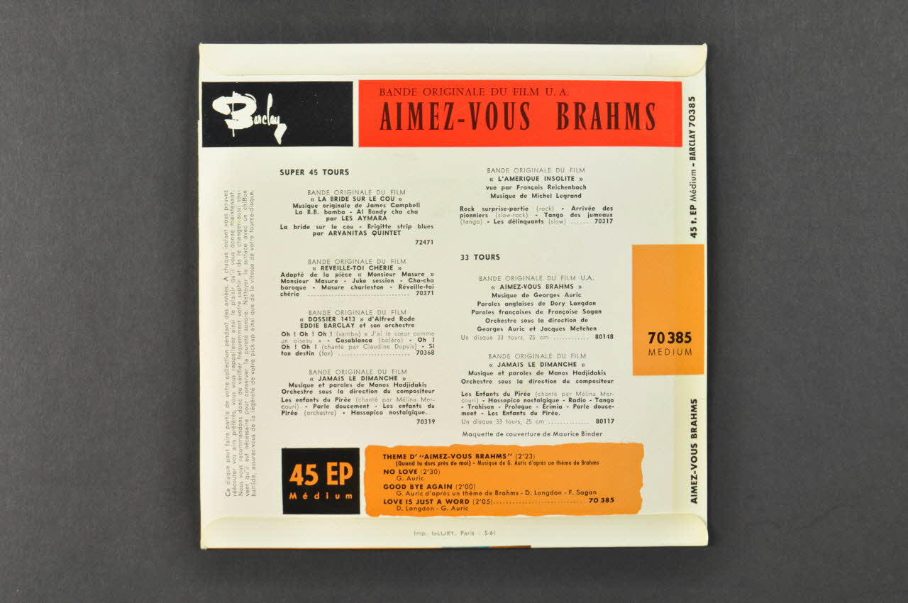 Il est conservé dans une pochette .2 en papier cartonné et plastifié, de forme carrée. La face avant est divisée en deux zones horizontales : en haut, le titre en orange sur fond noir avec des inscriptions blanches ; en bas, deux couples homme-femme face à face en couleurs vives, en buste. L'arrière présente un catalogue en noir sur fond blanc, et un bandeau rouge supérieur et deux bandeaux ocre en partie inférieure. Une petite languette prédécoupée reprenant le titre du disque est présente en haut du bord gauche de la face arrière, sur l'intérieur.