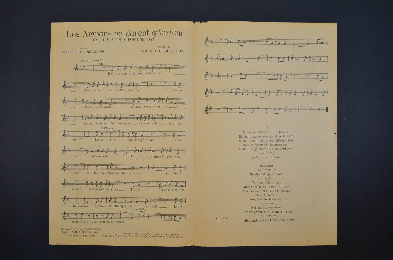 Les amours ne durent qu'un jour ... (Love lives only for one day), mélodie créée à la Gaîté Lyrique dans "le pont vivant" par Yette Yriel.